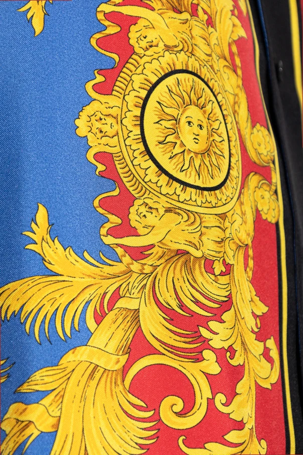 Koszula urzeka bogatą, multikolorową kompozycją – błękitne tło kontrastuje z intensywnymi żółto-złotymi detalami, czerwonymi panelami ozdobionymi finezyjnymi, roślinnymi ornamentami oraz czarnymi wykończeniami. Unikatowy motyw barokowych roślinnych zdobień oraz majestatycznych słońc z twarzą pojawia się zarówno z przodu, na rękawach, jak i na plecach, czyniąc ten projekt prawdziwie wyjątkowym symbolem indywidualizmu.