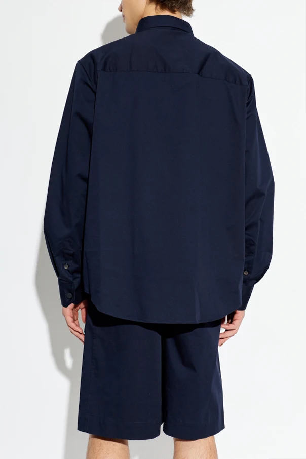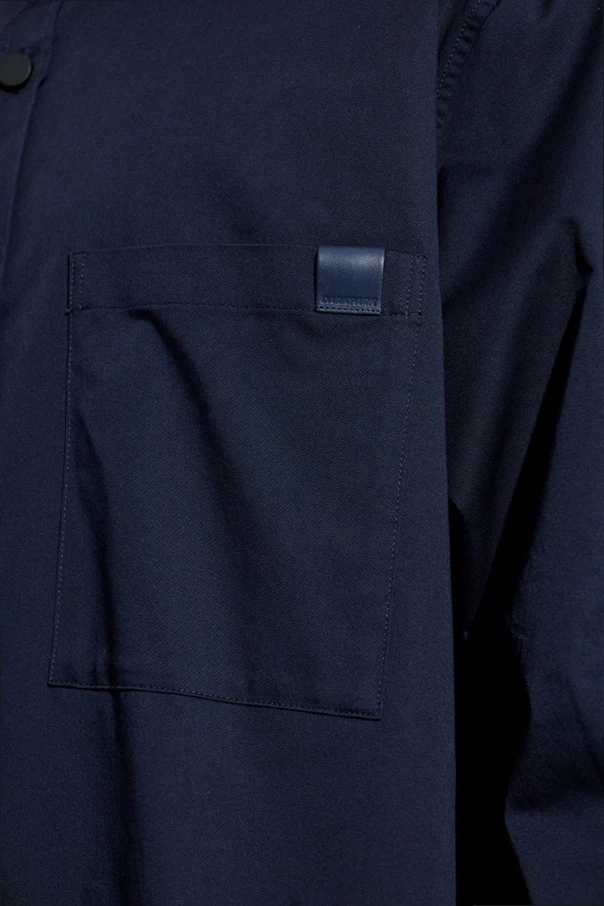Granatowy odcień tkaniny buduje wrażenie elegancji, natomiast klasyczny kołnierzyk oraz rząd matowych guzików w harmonizującym kolorze podkreślają spójność projektu. Wyjątkowego charakteru nadaje koszuli obszerna kieszeń na lewej piersi oraz dyskretny akcent designerski w postaci subtelnie wszytej naszywki.
