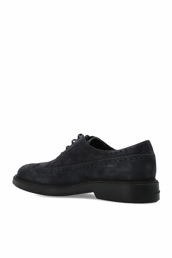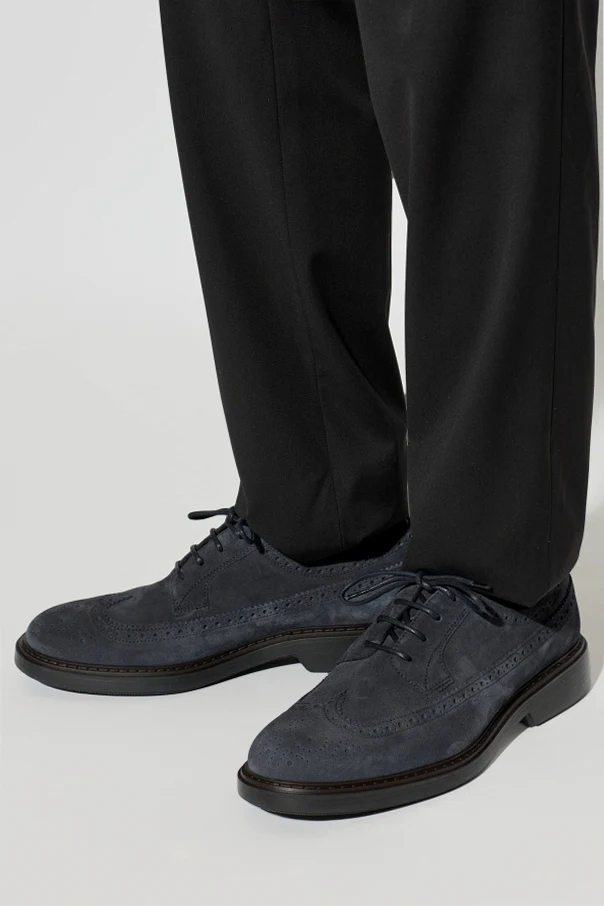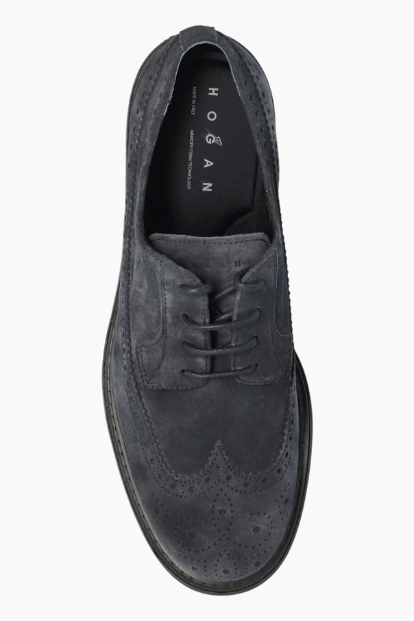 Granatowy zamsz najwyższej jakości nadaje butom matowy, aksamitny wygląd i niepowtarzalną miękkość w dotyku. Dyskretne logo „Hogan” we wnętrzu świadczy o szlachetności marki, zaś płaskie, sznurowane czterodzugowo sznurowadła doskonale współgrają z całością.