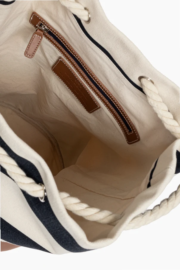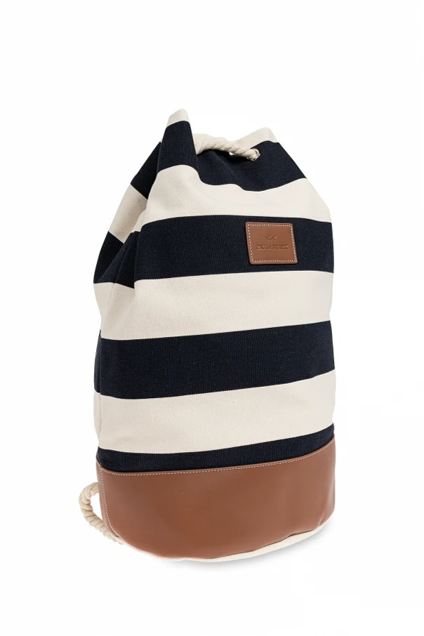 Model wyróżniają wyraziste, poziome pasy w odcieniach granatowym oraz kremowym, podkreślone detalami z delikatnej skóry licowej w kolorze jasnobrązowym. Trwała, grubo tkana tkanina bawełniana zapewnia długowieczność produktu, a rozpoznawalna, tłoczona skórzana naszywka dopełnia całość unikatowym akcentem.