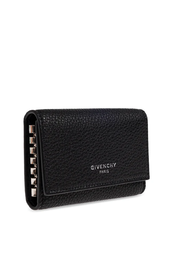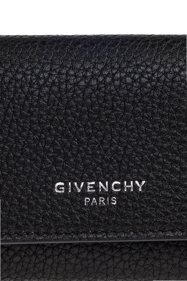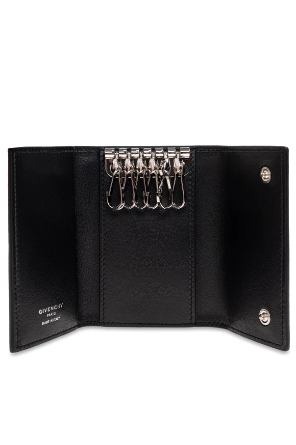 Skórzane etui na klucze marki Givenchy emanuje ponadczasową elegancją oraz kunsztem rzemiosła. Prostokątna forma o składanej, trójdzielnej konstrukcji została wykonana z naturalnej, groszkowanej skóry cielęcej w głębokim odcieniu czarnym. Klasyczny, minimalistyczny design podkreśla centralnie wytłoczone logo Givenchy Paris w kolorze srebrnym, wyrażając ekskluzywny charakter produktu.