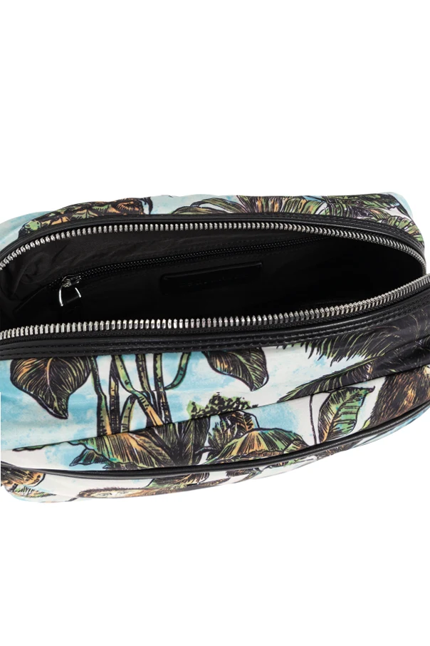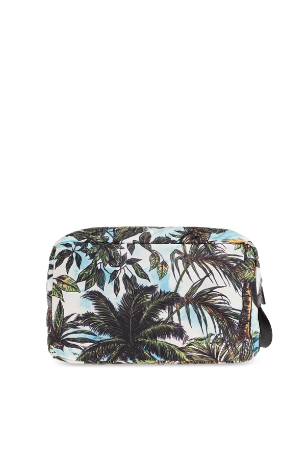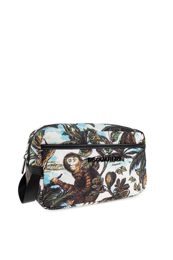 Kosmetyczka z logo marki Dsquared2 to kwintesencja wyrafinowanego stylu i funkcjonalności. Jej prostokątny, lekko zaokrąglony kształt z mocnym korpusem subtelnie podkreśla ekskluzywny charakter produktu. Oryginalny, malarski wzór nawiązujący do tropikalnej natury – misternie odwzorowane wizerunki małp wśród bujnej roślinności – przykuwa wzrok, budząc zachwyt precyzją wykonania.