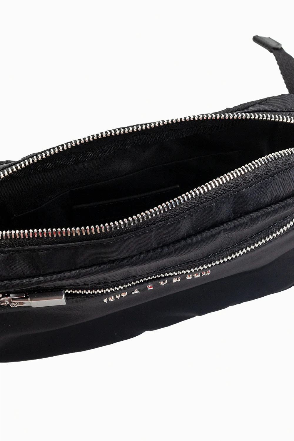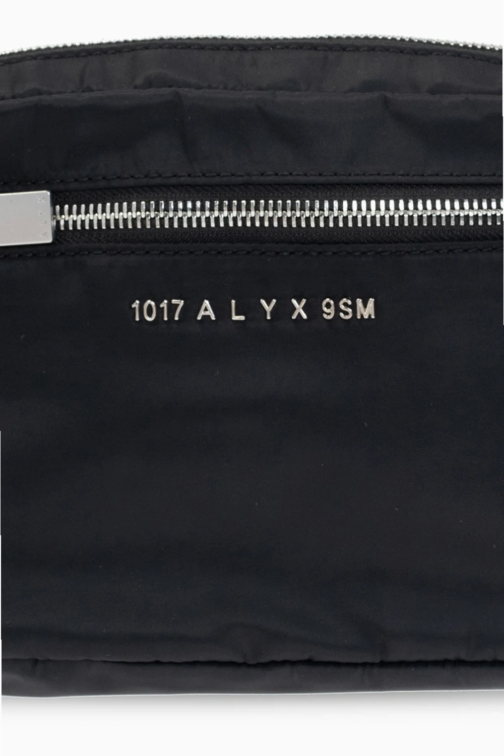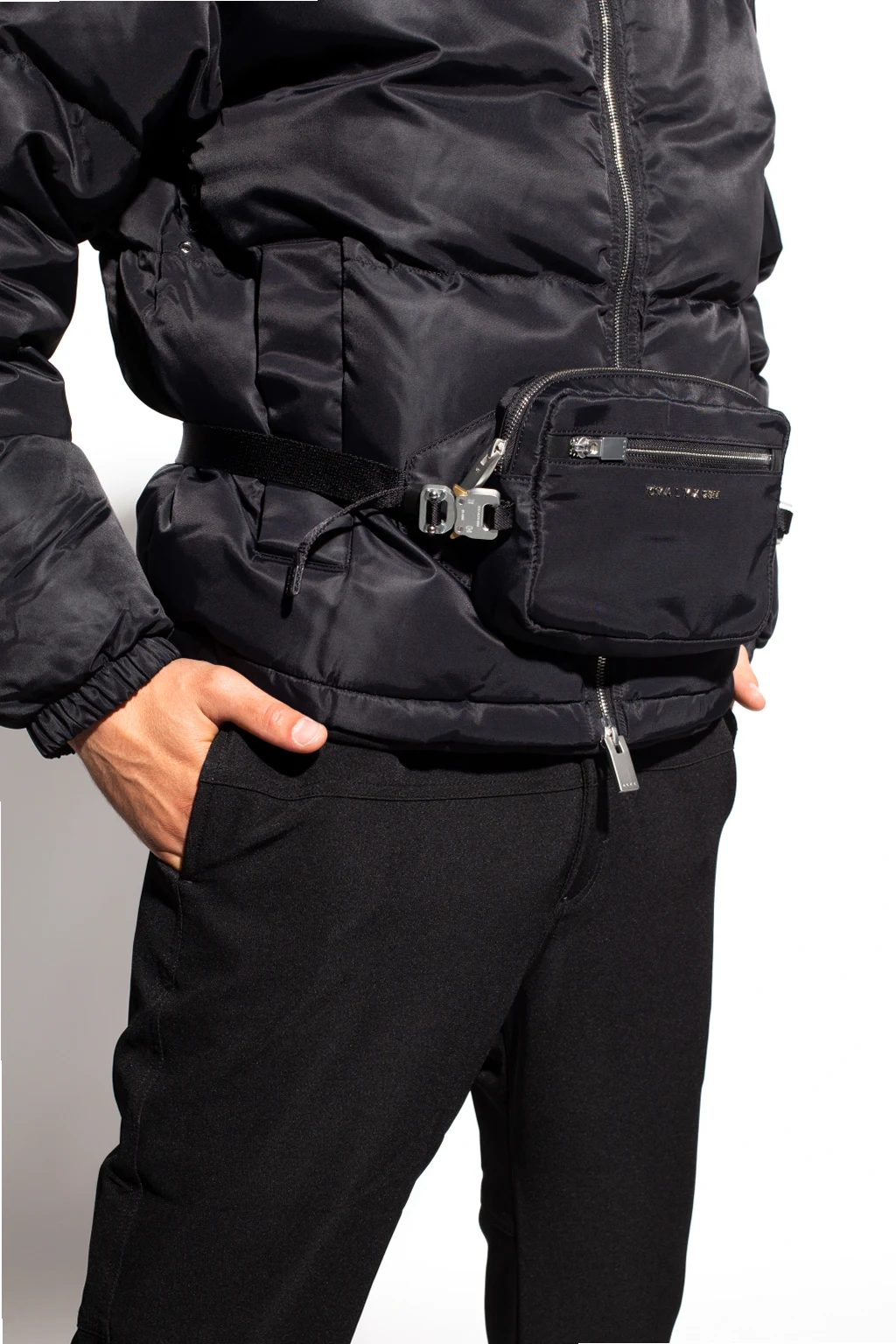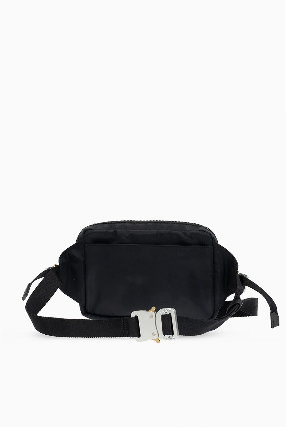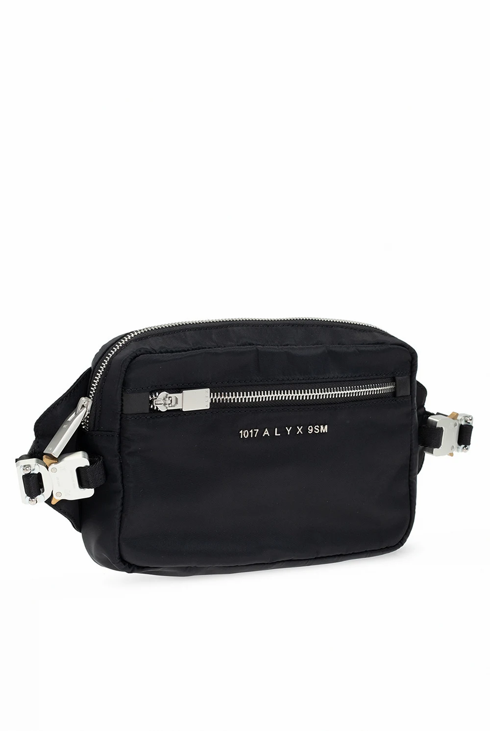 Czarna torba na pas 1017 ALYX 9SM. Zamykana na zamek. Z przodu metalowe logo w kolorze srebrnym oraz kieszeń zamykana na zamek. Z tyłu wsuwana kieszeń. Dekoracyjne, charakterystyczne klamry w kolorze srebrno-złotym. Pasek z możliwością regulacji długości. Wewnątrz komora oraz wsuwana kieszeń. Metalowe elementy w kolorze srebrnym.