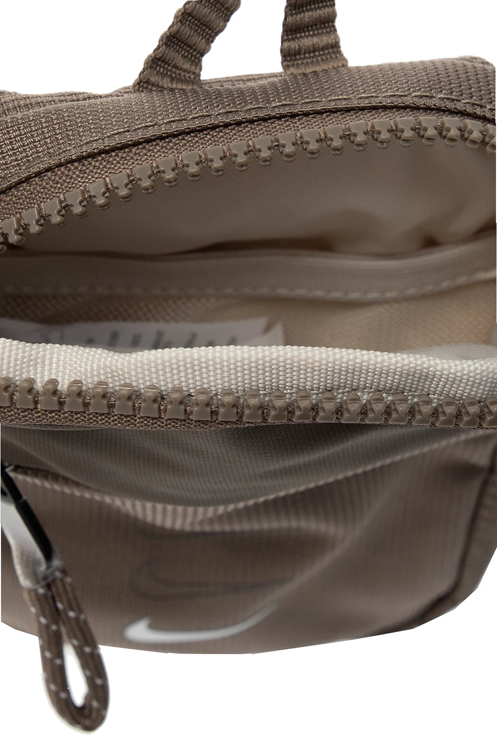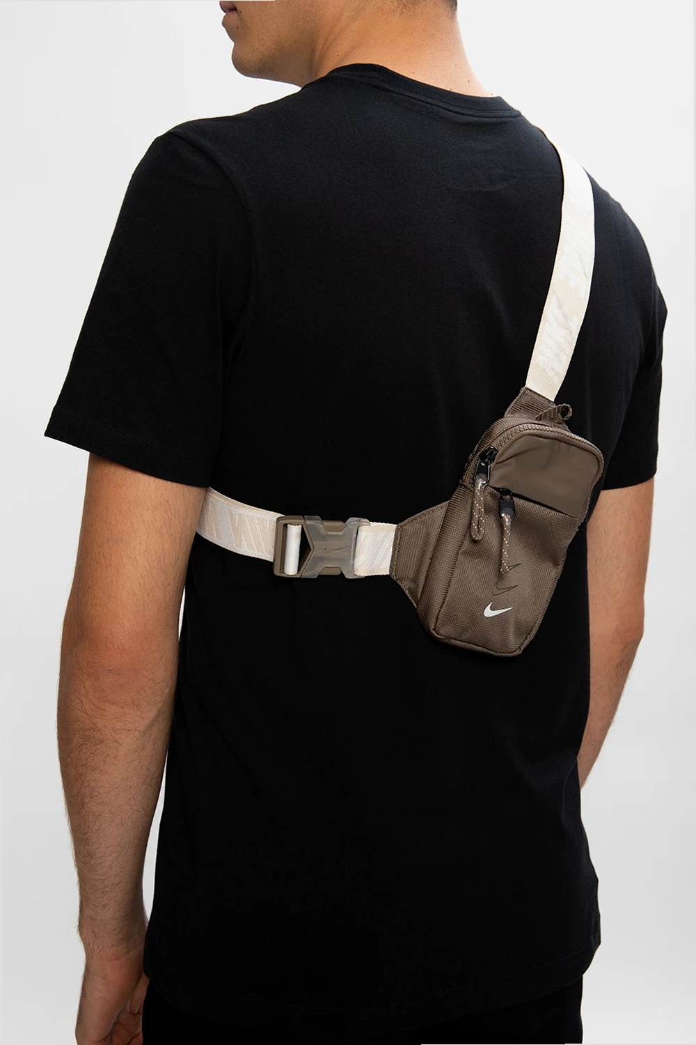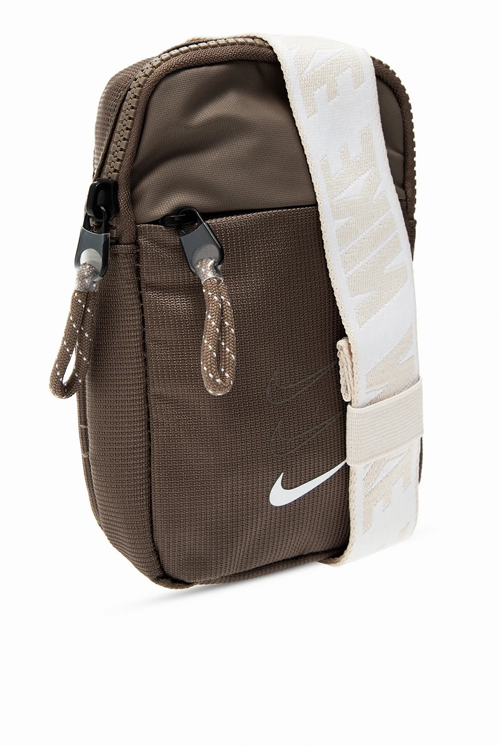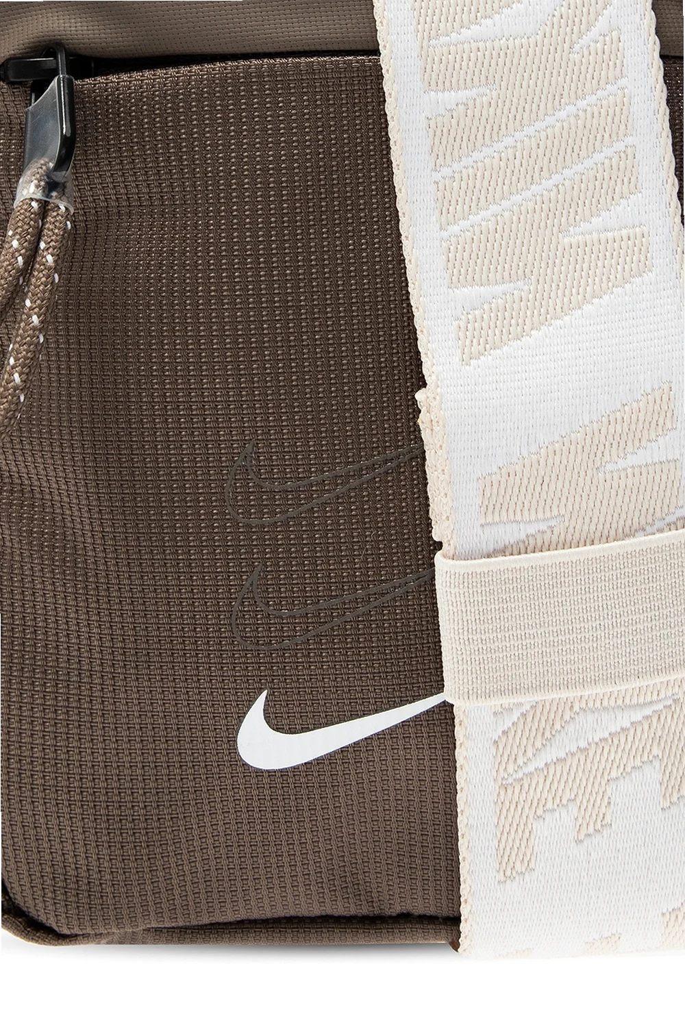 Brązowa torba na pas Nike. Zapinana na zamek. Nadrukowane logo w kolorze białym. Z przodu kieszeń zamykana na zamek. Z tyłu wykończona siatką. Beżowo-biały pasek z klamrą z możliwością regulacji. Wewnątrz komora i wsuwana kieszeń wykonana z siatki.