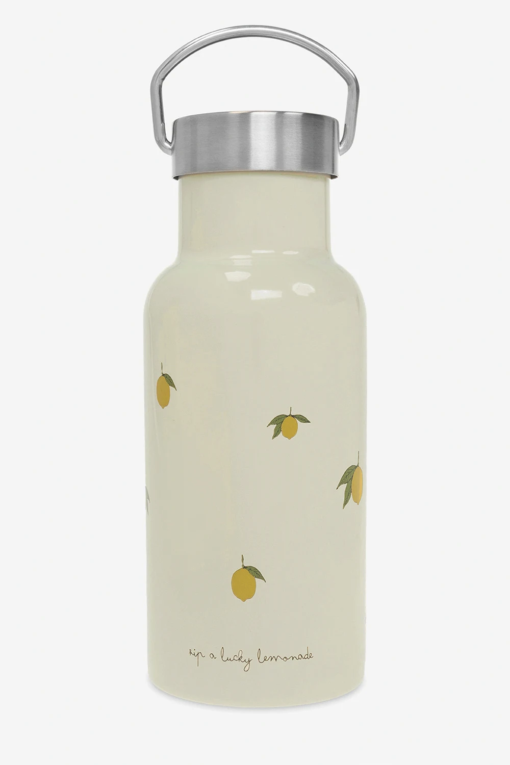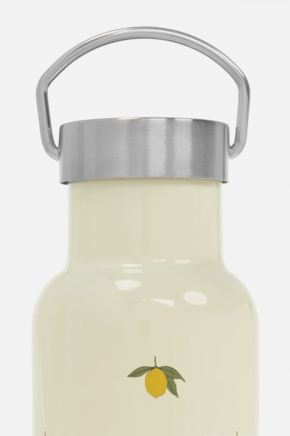 Żółta butelka termiczna Konges Slojd. Wykonana w 100% ze stali nierdzewnej przeznaczonej do kontaktu z żywnością. Utrzymuje zimne napoje i ciepłe napoje. Dołączone dwie pokrywki. Ozdobiona wzorem w kształcie cytryn.