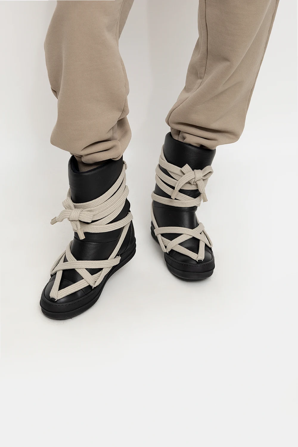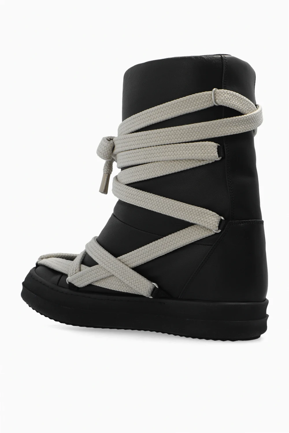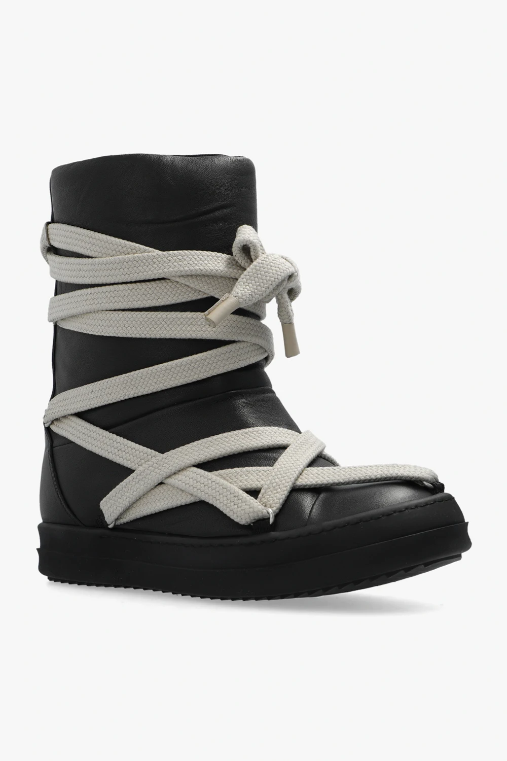 Czarne buty za kostkę, model ‘Jumbo Puffer’ Rick Owens. Wykonane ze skóry. Dekoracyjne, beżowe sznurowadła. Gumowa, czarna podeszwa.