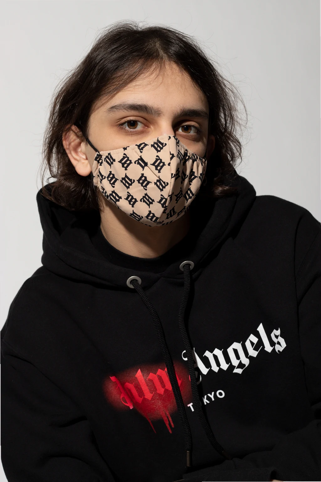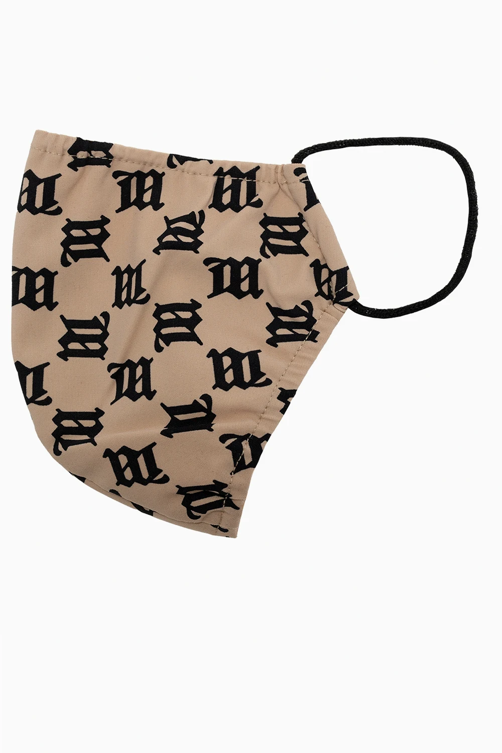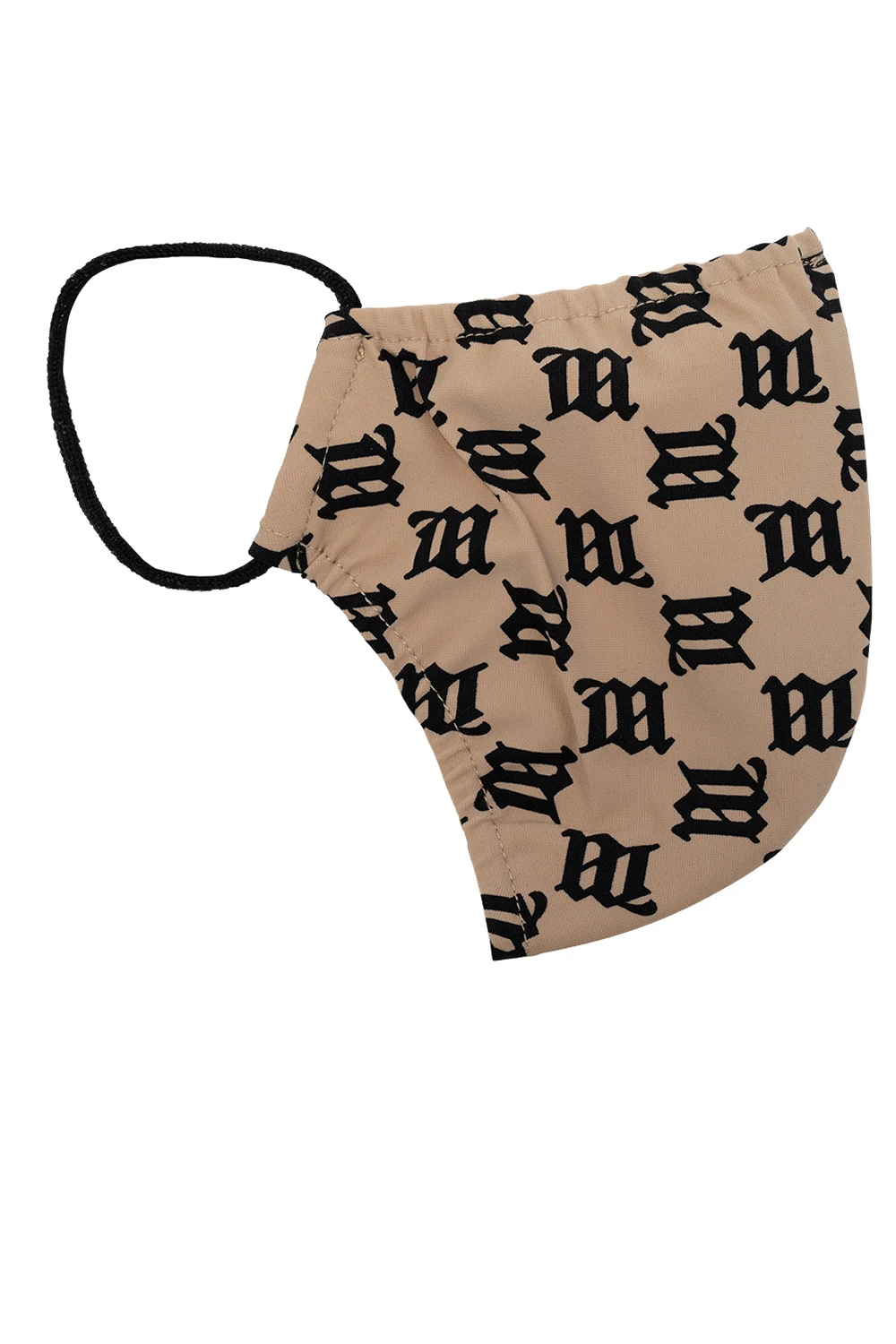 Beżowa maska MISBHV. Wykonana z materiału pochodzącego z recyklingu. Nadrukowany wzór z logo w kolorze czarnym.