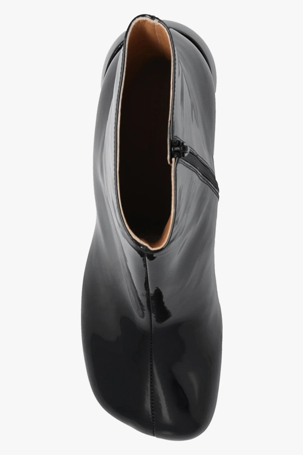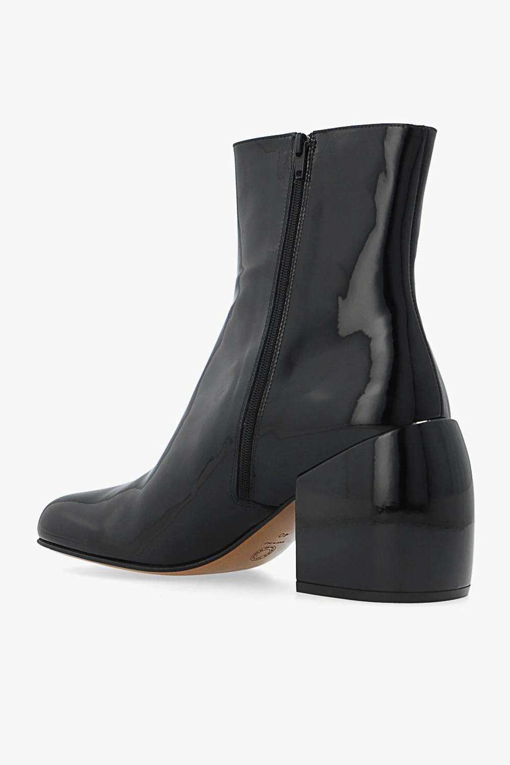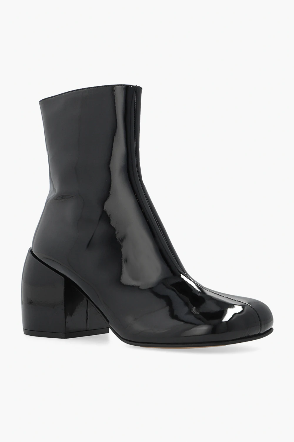 Czarne botki na obcasie Dries Van Noten. Wykonane z lakierowanej skóry cielęcej. Z boku zapinane na zamek. Kwadratowy, ścięty nosek. Beżowa, skórzana podeszwa.