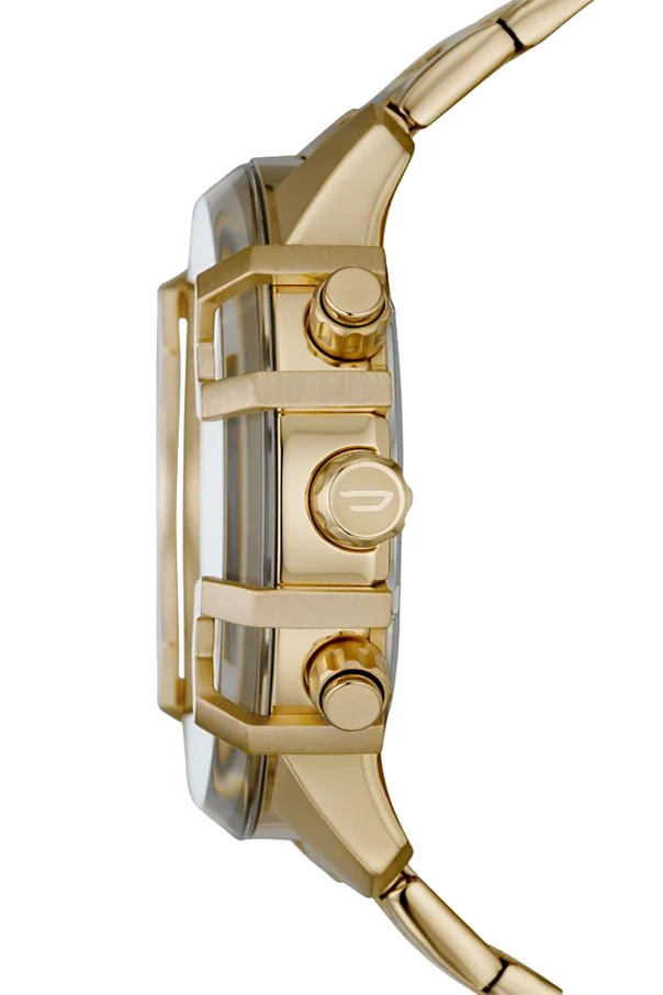 Tarcza w jednolitym, złotym kolorze zachwyca wyraźnie zarysowanymi indeksami oraz widocznymi sub-tarczami chronografu. Nieszablonowe rozmieszczenie okna datownika między godziną 8 a 9 oraz obecność rozbudowanych przycisków sterujących i osłon wokół tarczy nadają zegarkowi niepowtarzalny, męski wyraz. Dbałość o detale potwierdzają ozdobne łapy oraz wyeksponowane logo Diesel na tarczy i zapięciu.