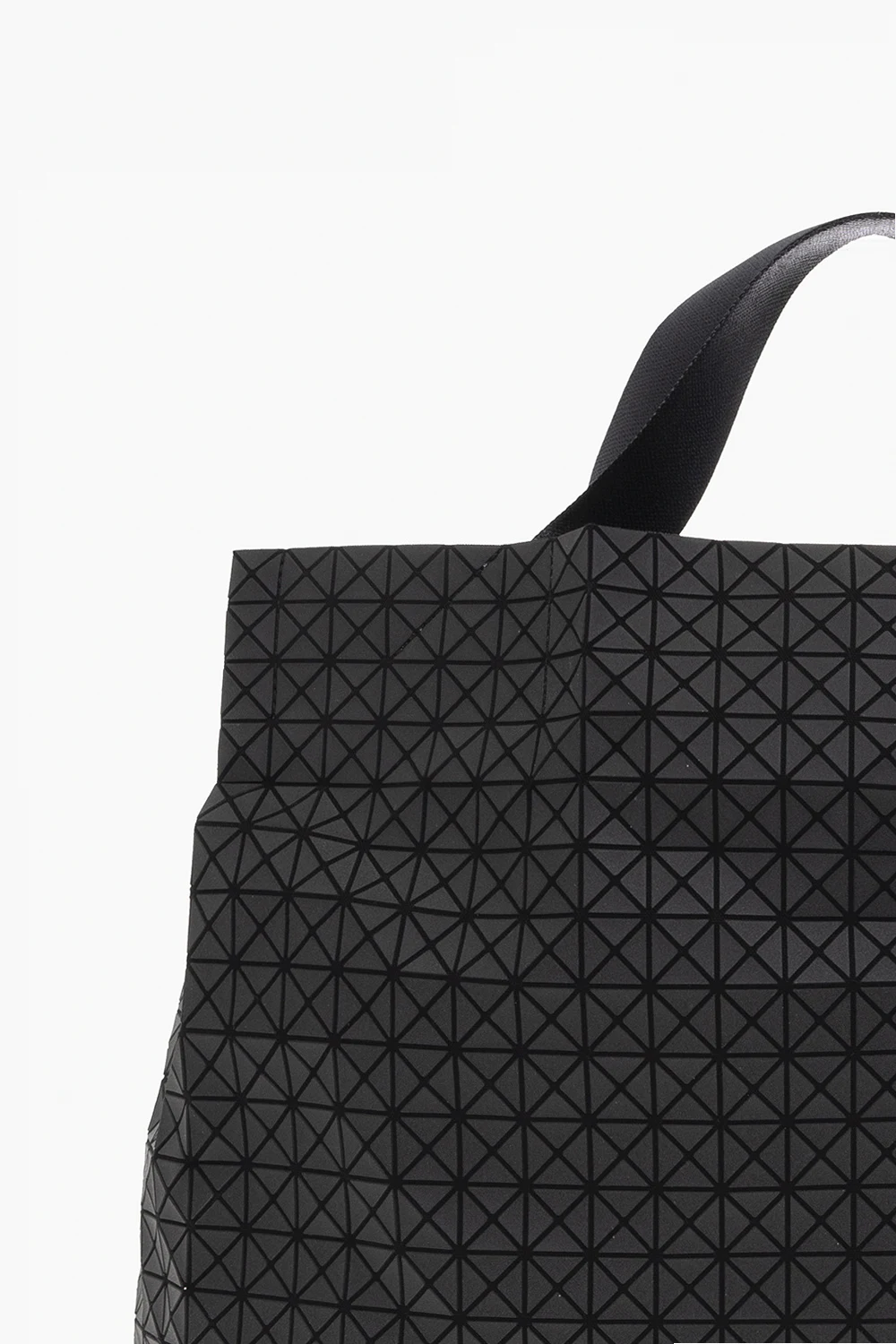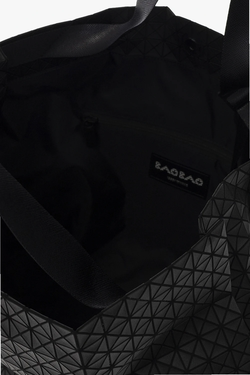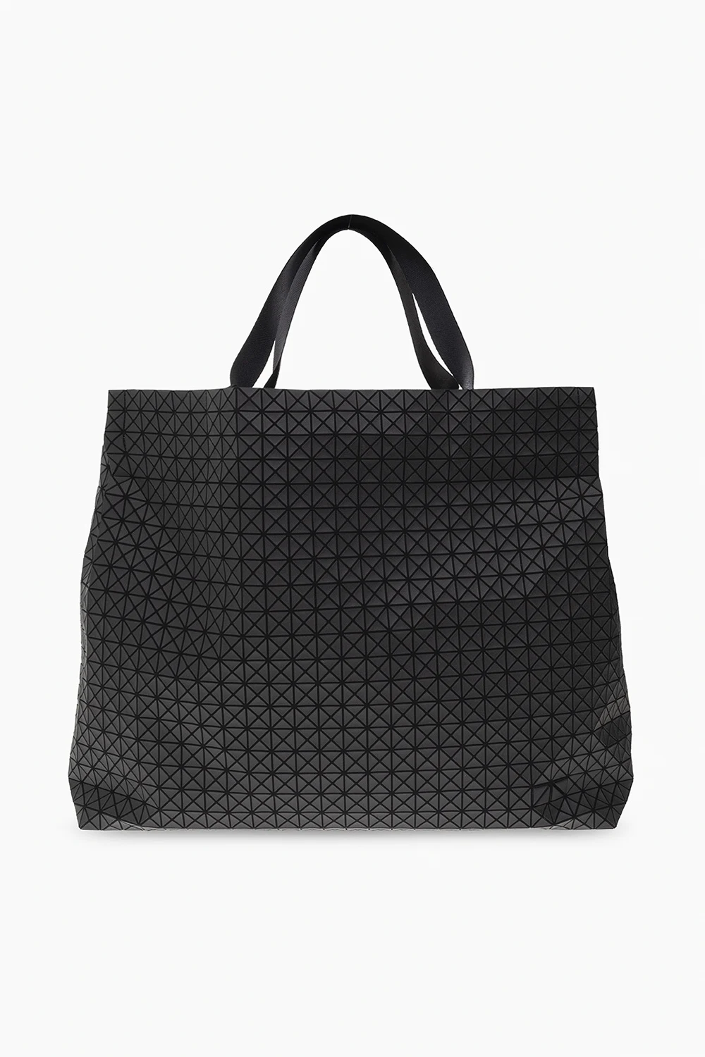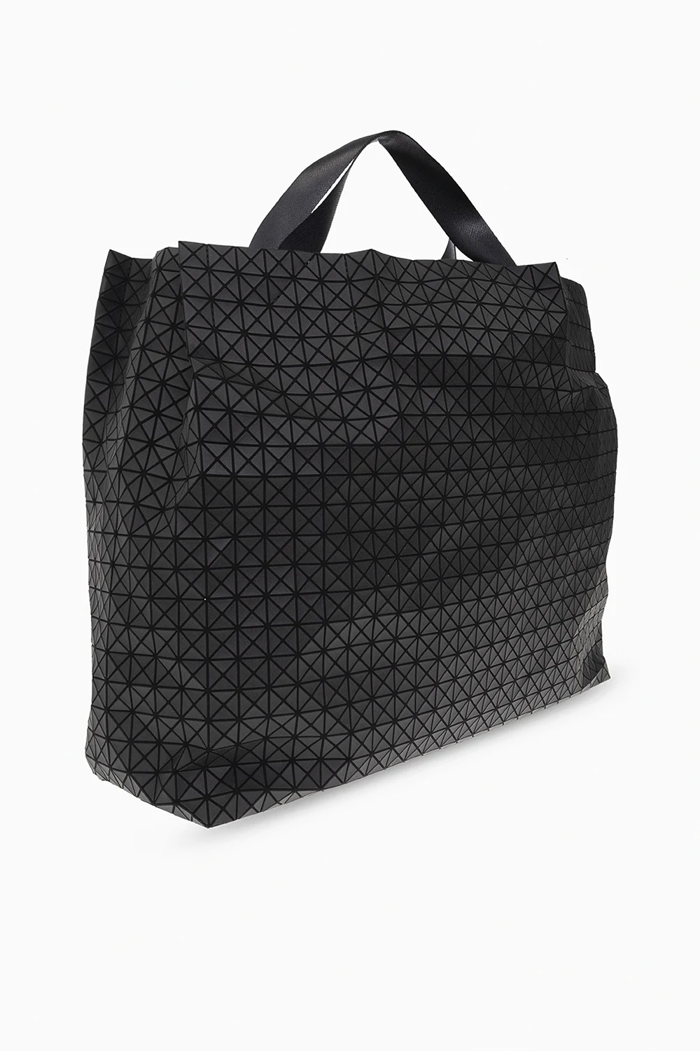 Czarna torba typu ‘shopper’, model ‘Cart’ Issey Miyake Bao Bao. Wykonana z bawełnianego płótna całkowicie pokrytego gumowymi aplikacjami tworzącymi geometryczny wzór. Zamykana na zatrzask. Dwie rączki z możliwością regulacji długości. Wewnątrz komora z kieszenią zamykaną na zamek.