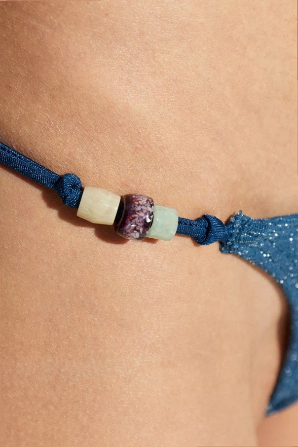 Dół od kostiumu kąpielowego „Vista” marki Bond-Eye to kwintesencja wyrafinowanej prostoty i niepowtarzalnego stylu. Niebieski odcień tkaniny, delikatnie połyskujący drobnymi iskrzeniami, przyciąga wzrok subtelnym blaskiem, podkreślając ekskluzywność wyrobu. Klasyczny, mocno wycięty krój bikini typu tanga o niskim stanie odsłania sylwetkę w sposób minimalistyczny, ukazując nowoczesne podejście do mody plażowej.