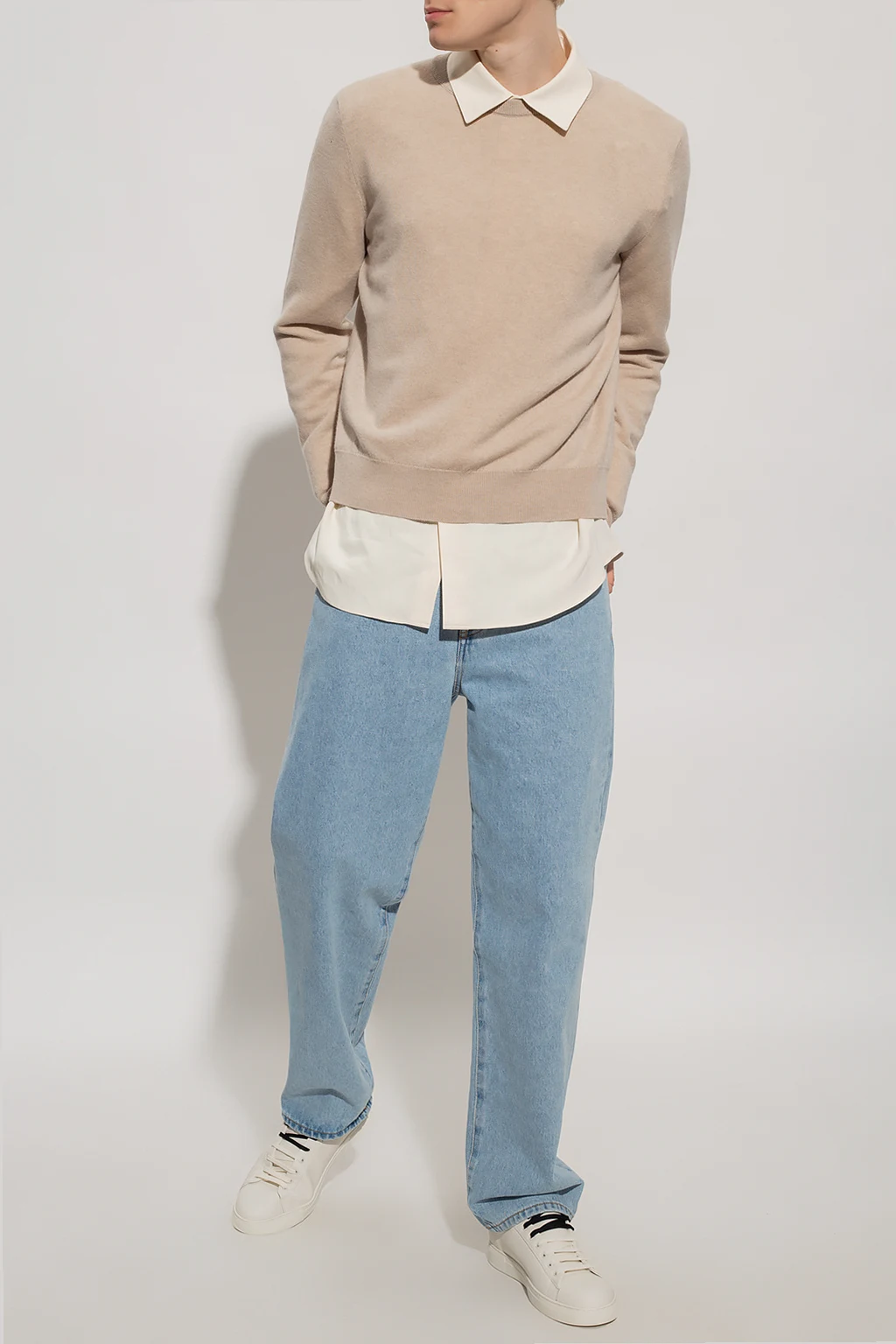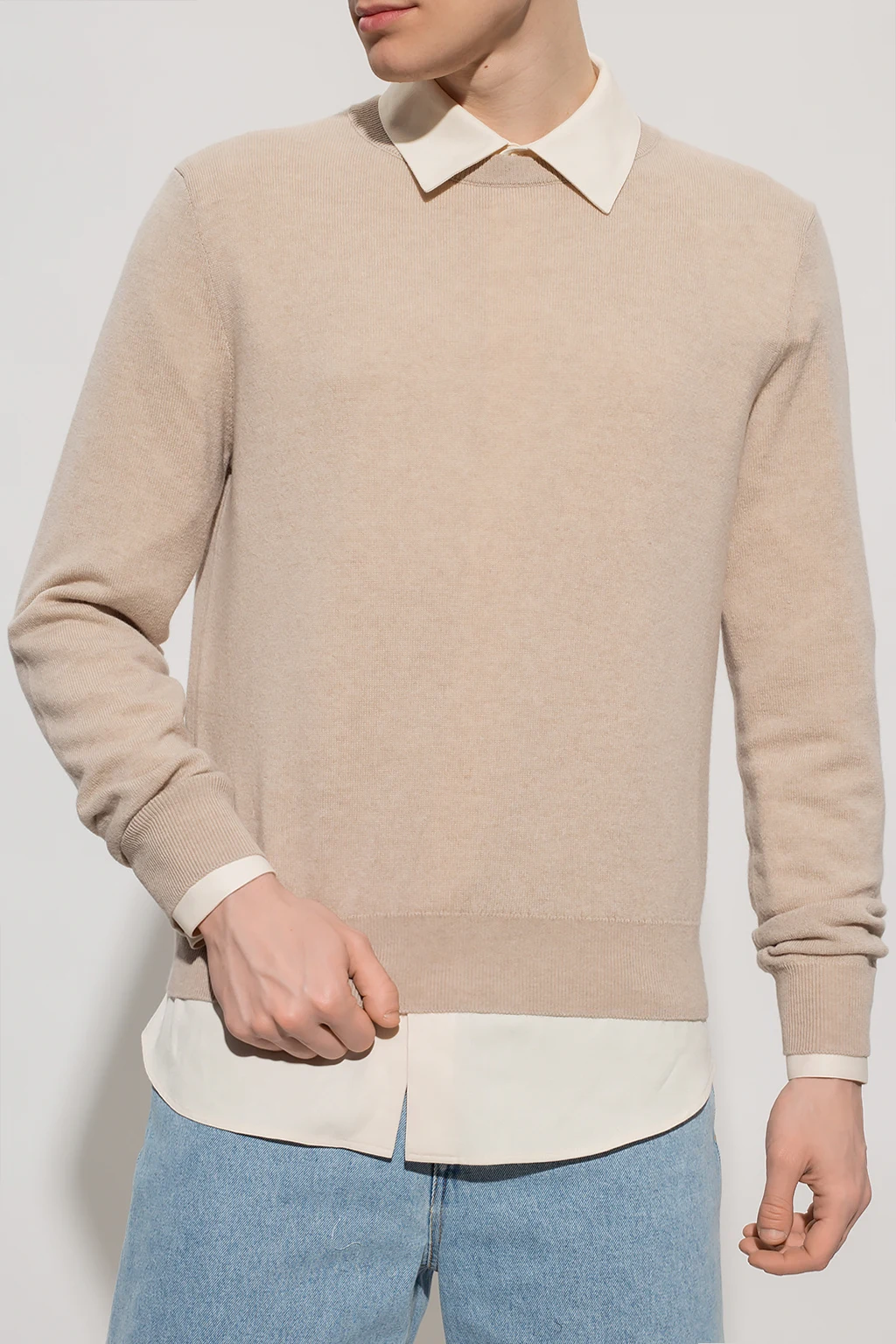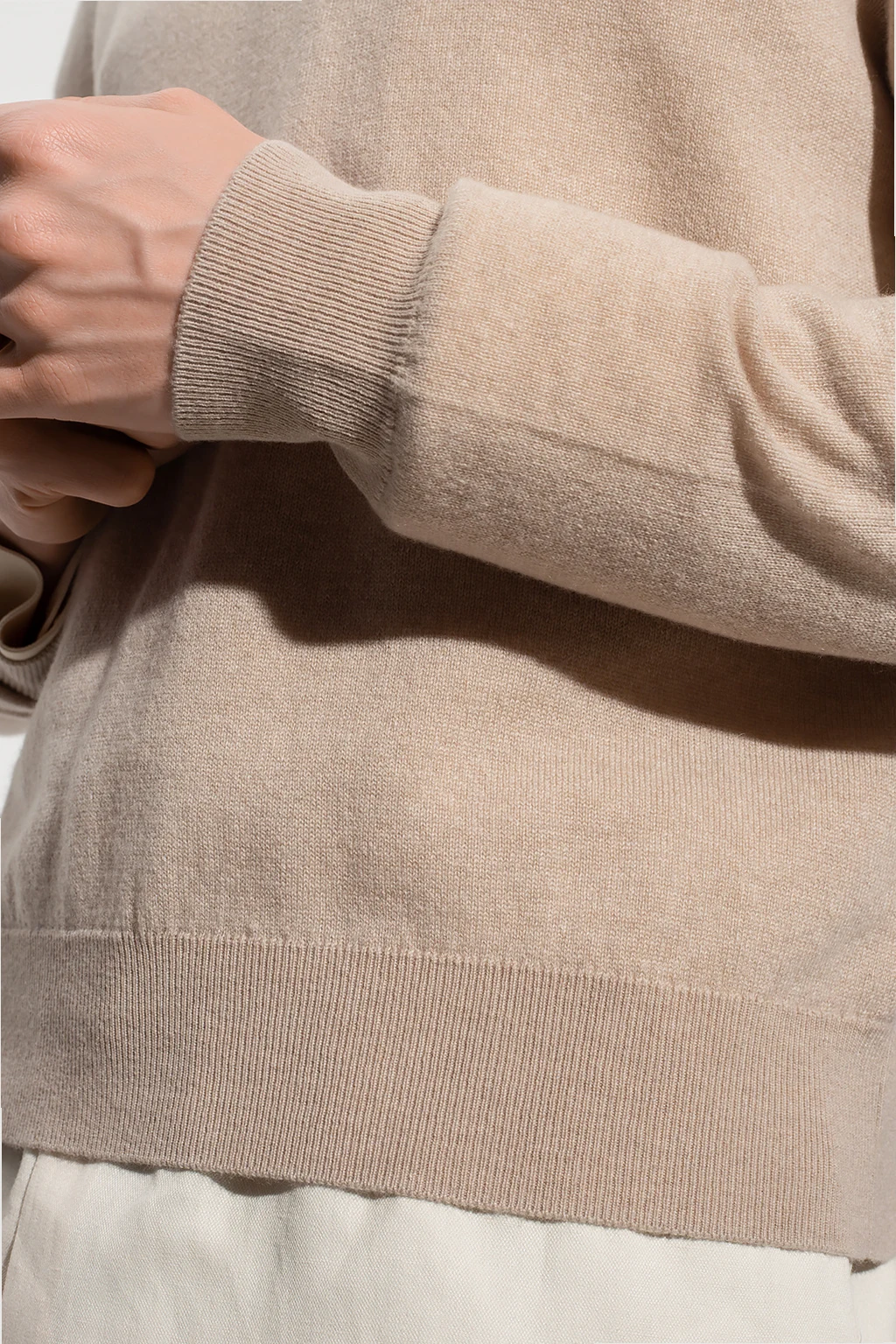 Beżowy sweter, model ‘Benji’ The Row. Wykonany z kaszmiru. Okrągły dekolt, dół i długie rękawy wykończone ściągaczem.