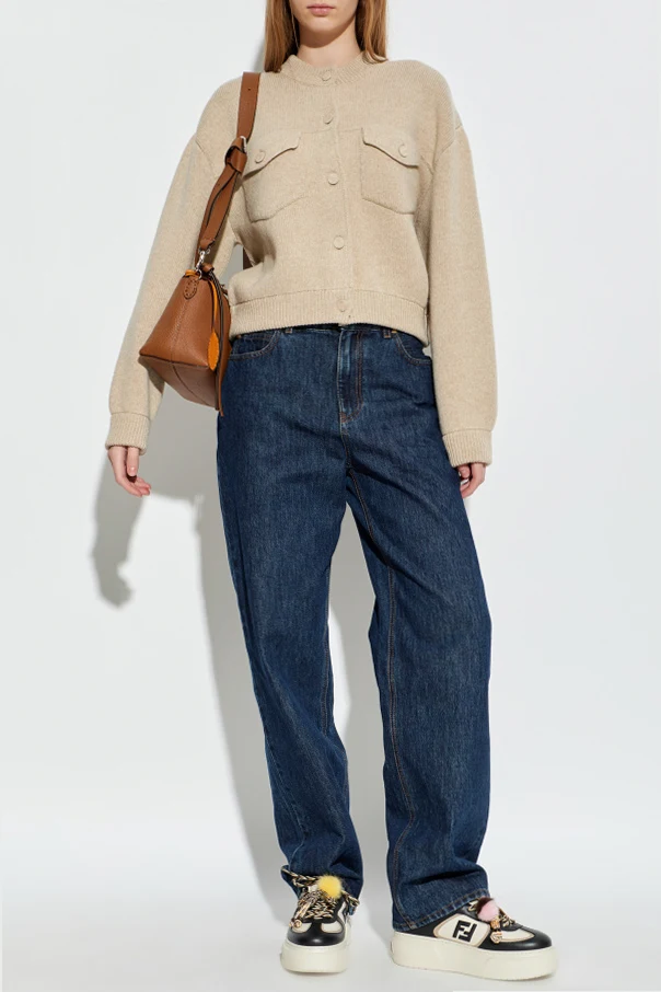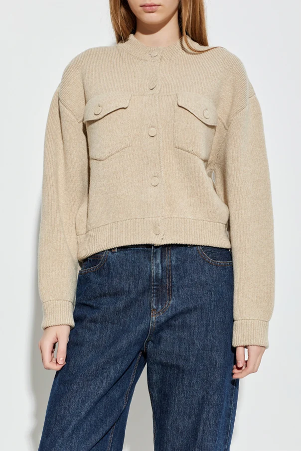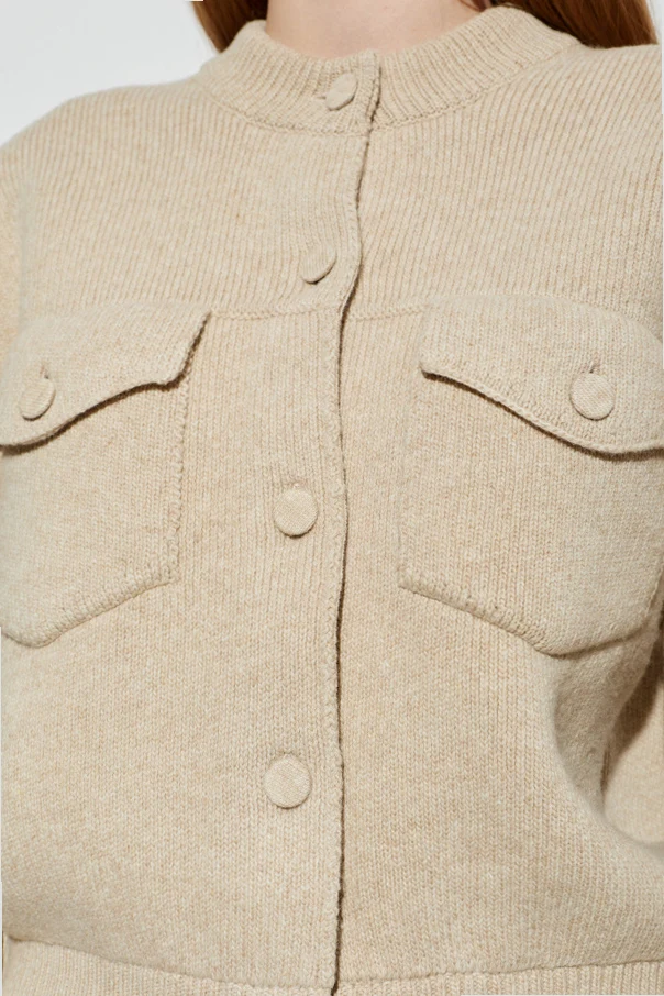 Kardigan z kieszeniami to kwintesencja wyrafinowanego komfortu, który łączy w sobie ponadczasową elegancję i nowoczesną swobodę. Wykonany z wyjątkowo miękkiej i gęstej dzianiny z wełny, prezentuje delikatny, jednolity beżowy odcień, podkreślający szlachetność materiału.