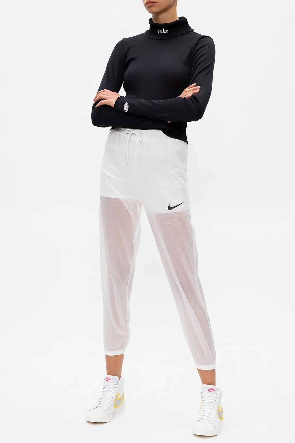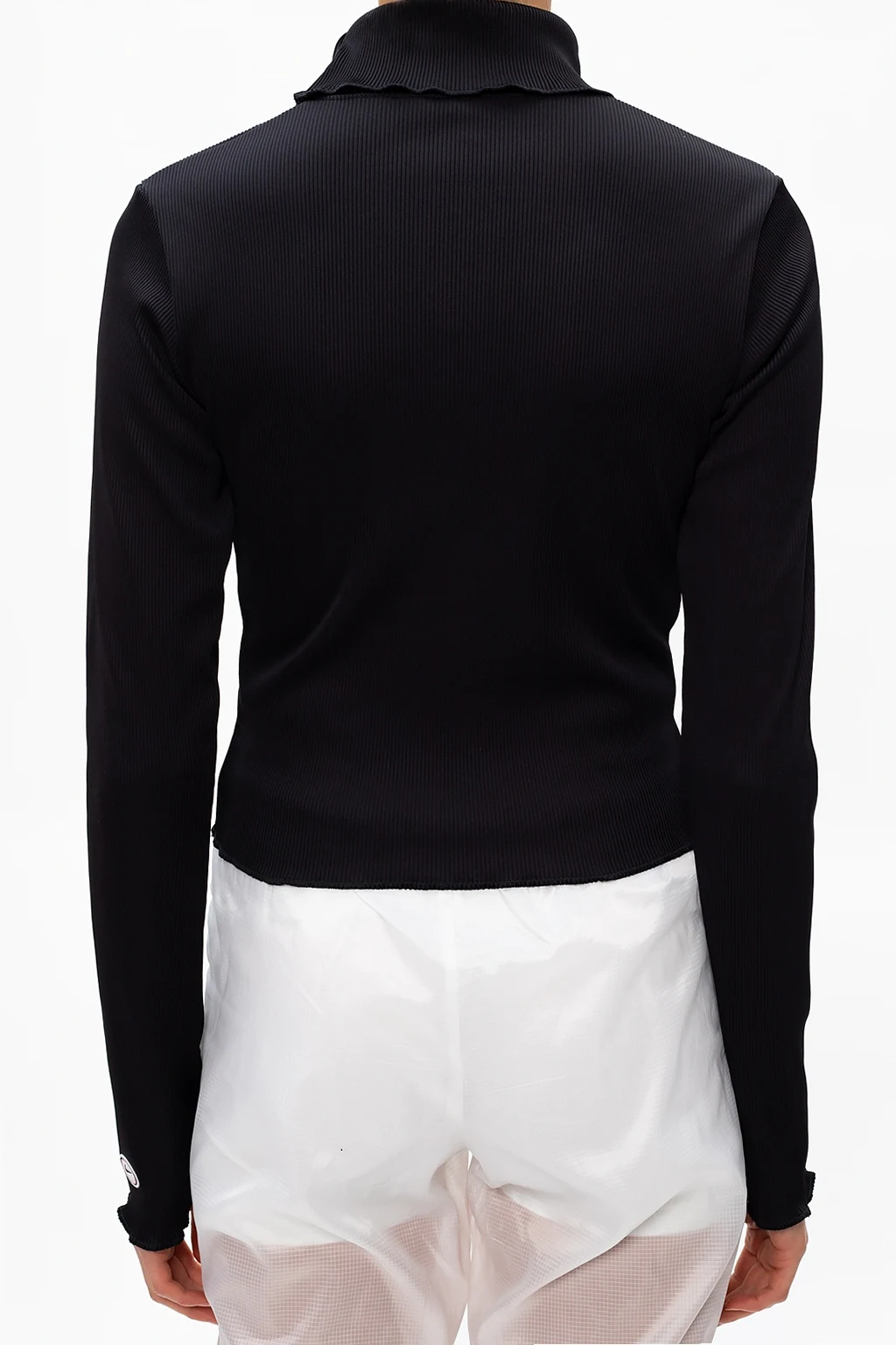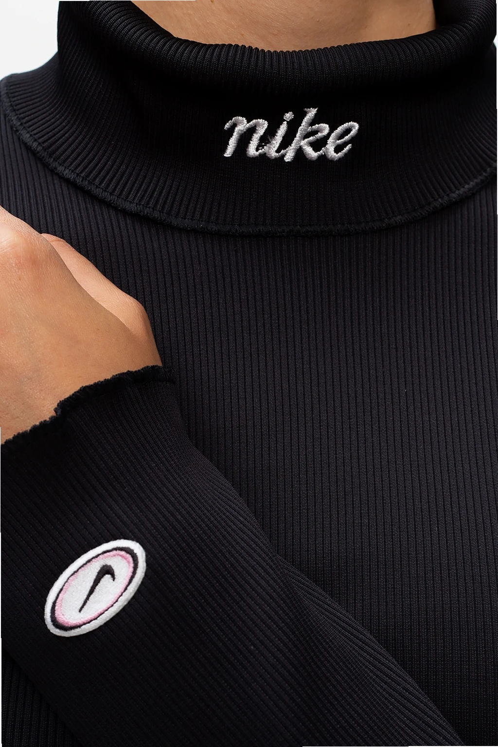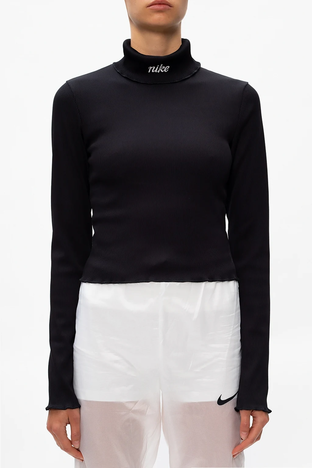 Czarny, prążkowany golf Nike. Wyszyte logo w kolorze białym. Długie rękawy zakończone falbaną.