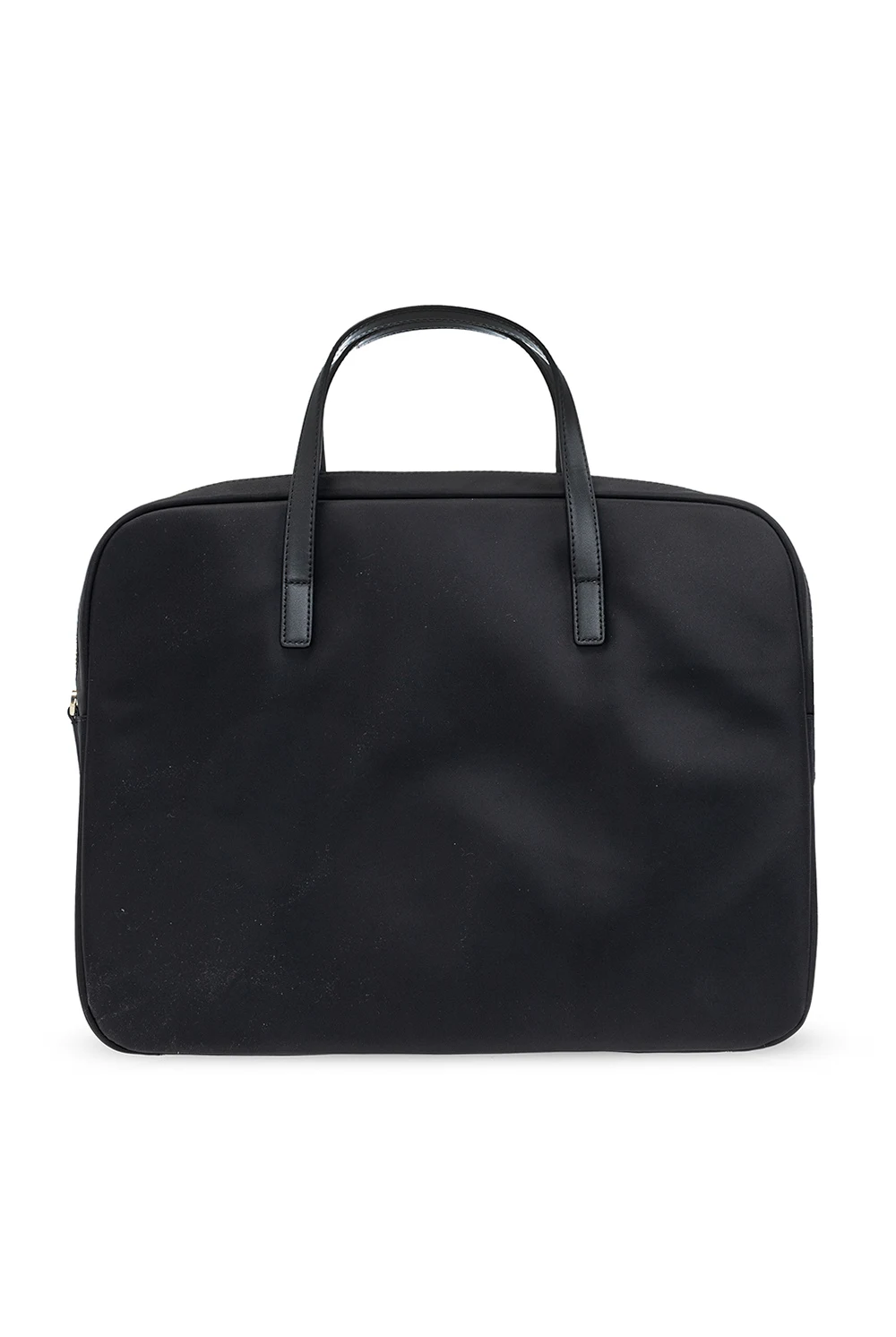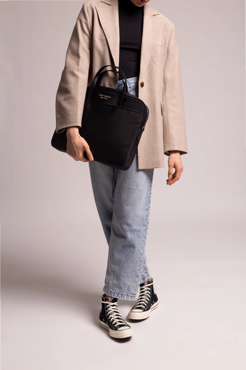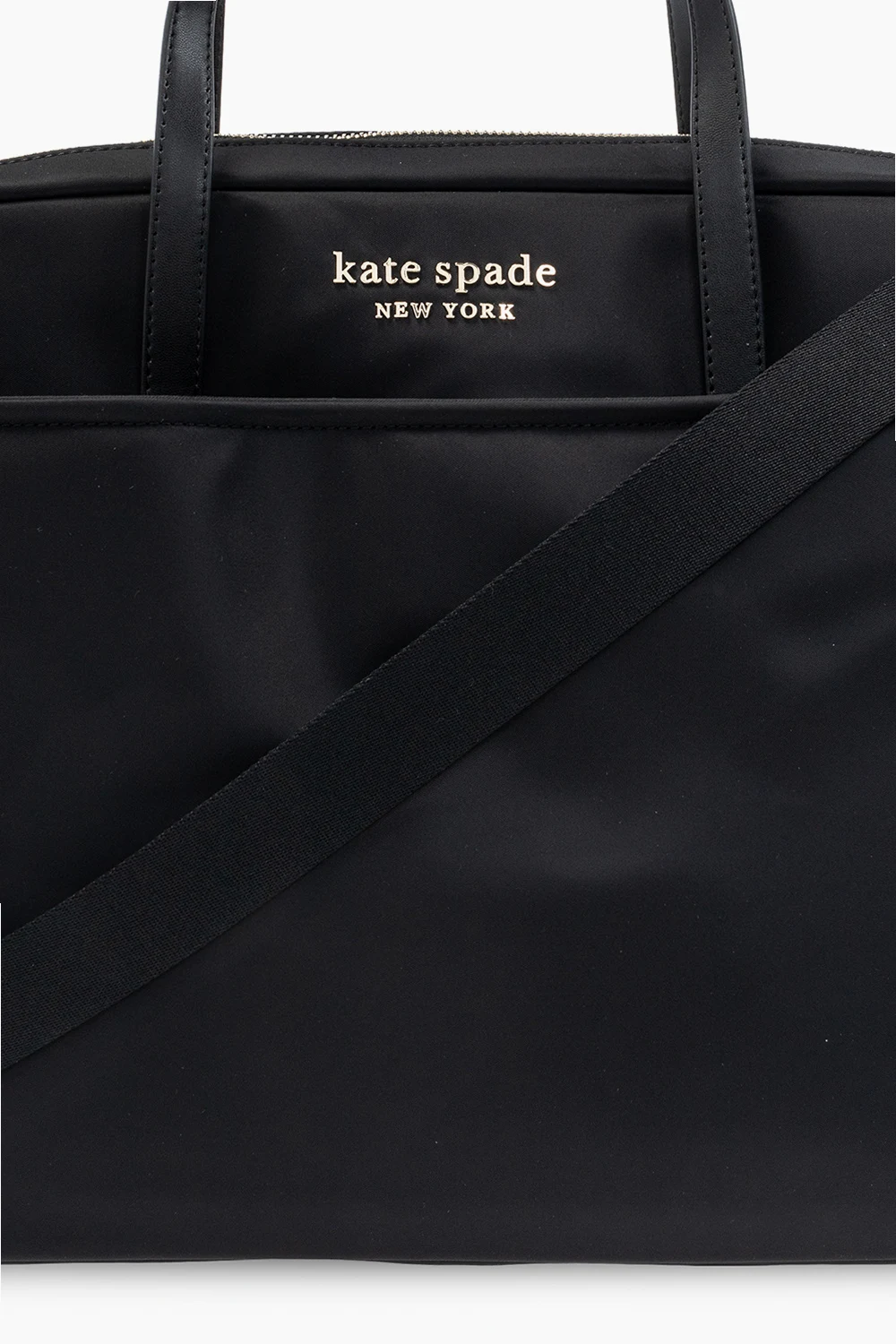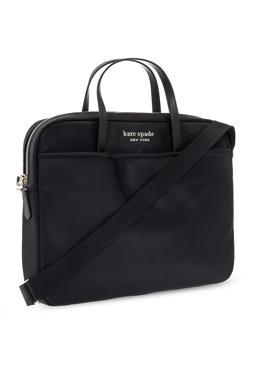 Czarna torba na laptopa Kate Spade. Zamykana na zamek. Ozdobiona aplikacją z logo. Z przodu wsuwana kieszeń. Dwie półokrągłe rączki. Pas na ramię z możliwością regulacji długości. Wewnątrz komora oraz trzy kieszenie: dwie wsuwane oraz zapinana na zatrzask. Metalowe wykończenie w kolorze srebrnym.