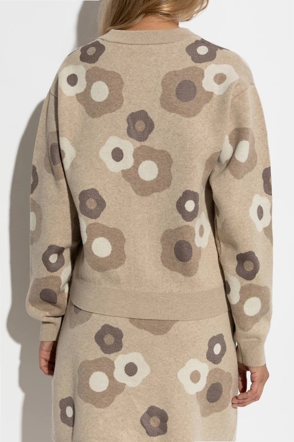 Kardigan z motywem kwiatowym marki Kenzo to synonim wyrafinowania oraz subtelnej elegancji. Utrzymany w stonowanych odcieniach beżu, brązu i bieli, zachwyca bogatym, graficznym wzorem kwiatowym, podkreślając wyjątkowy charakter stylizacji. Klasyczny fason z długimi rękawami oraz dekoltem w szpic idealnie łączy wygodę z ekskluzywną estetyką, a starannie umieszczone guziki dopełniają formę z elegancją.