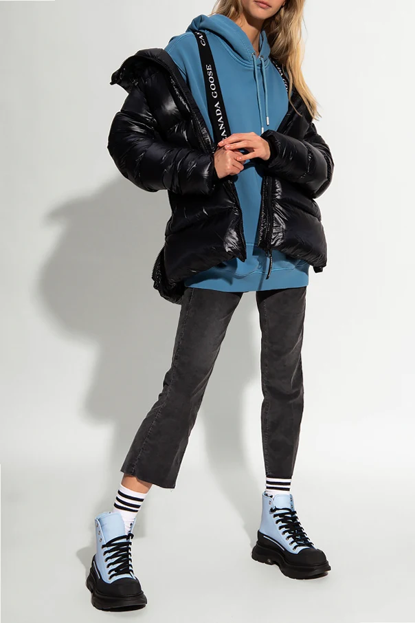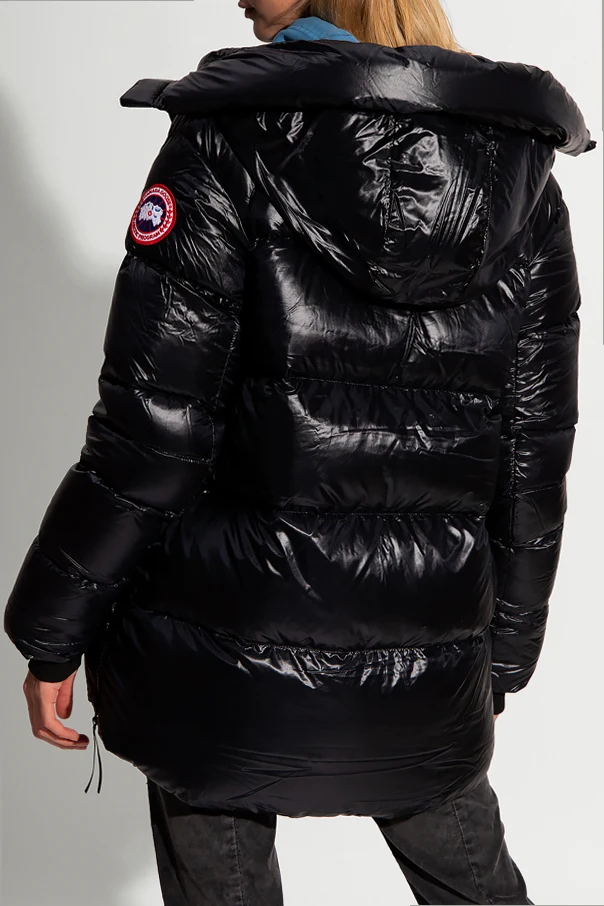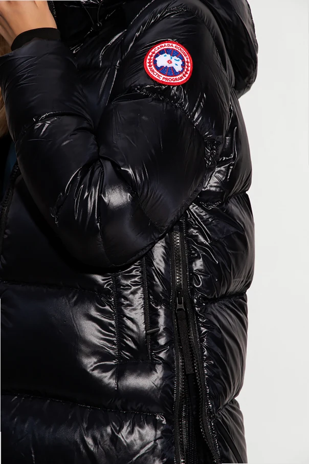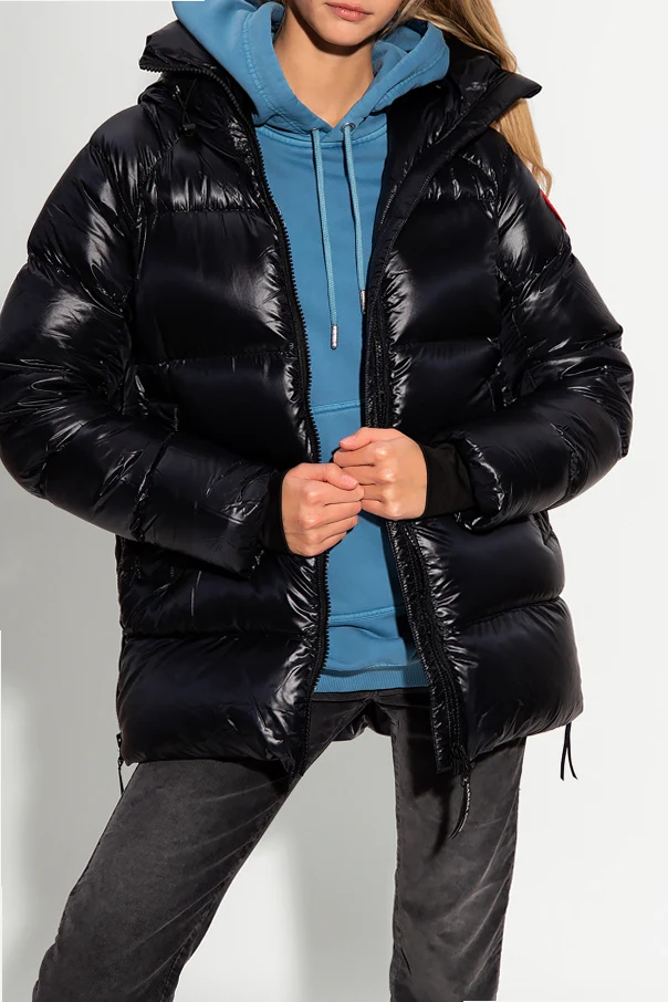 Czarna, pikowana kurtka Canada Goose. Zapinana na dwubiegunowy zamek. Ozdobiona naszywką z logo w kolorze czerwono-biało-granatowym. Kaptur ściągany trokami. Dwie kieszenie zapinane na zamek. Szelki wewnętrzne. Na dole zapinana na zamek. Długie rękawy zakończone ściągaczem.