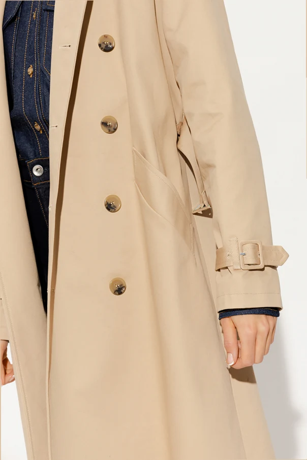 Beżowy, bawełniany trencz A.P.C. Dwurzędowe zapięcie na guziki. W talii regulowany pasek z klamrą. Dwie wsuwane kieszenie. Z tyłu pojedyncze rozcięcie. Długie rękawy zakończone regulowanym paskiem z klamrą.