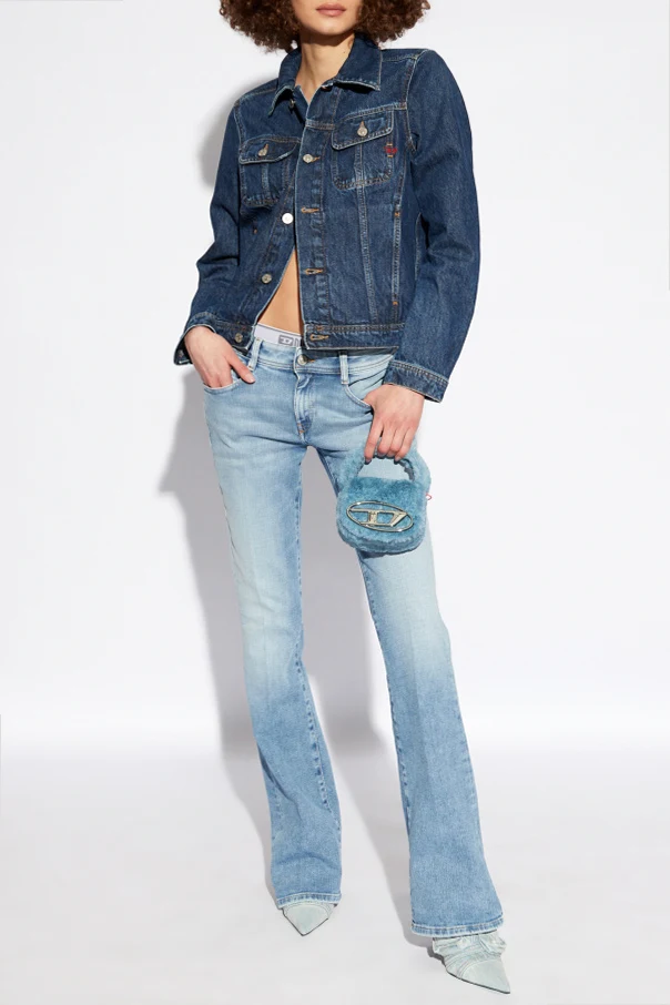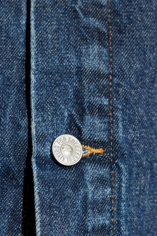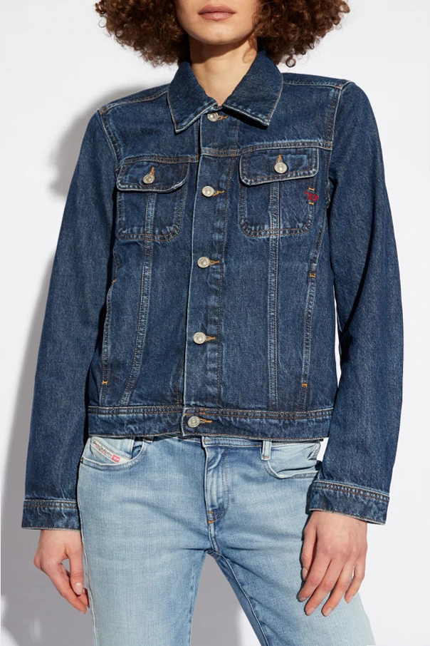 Granatowa kurtka jeansowa, model ‘DE-BONNY’ Diesel. Wykonana z bawełny. Zapinana na guziki. Ozdobiona wyszytym wzorem z logo w kolorze czerwonym. Cztery kieszenie: dwie wsuwane i dwie z patkami. Długie rękawy.