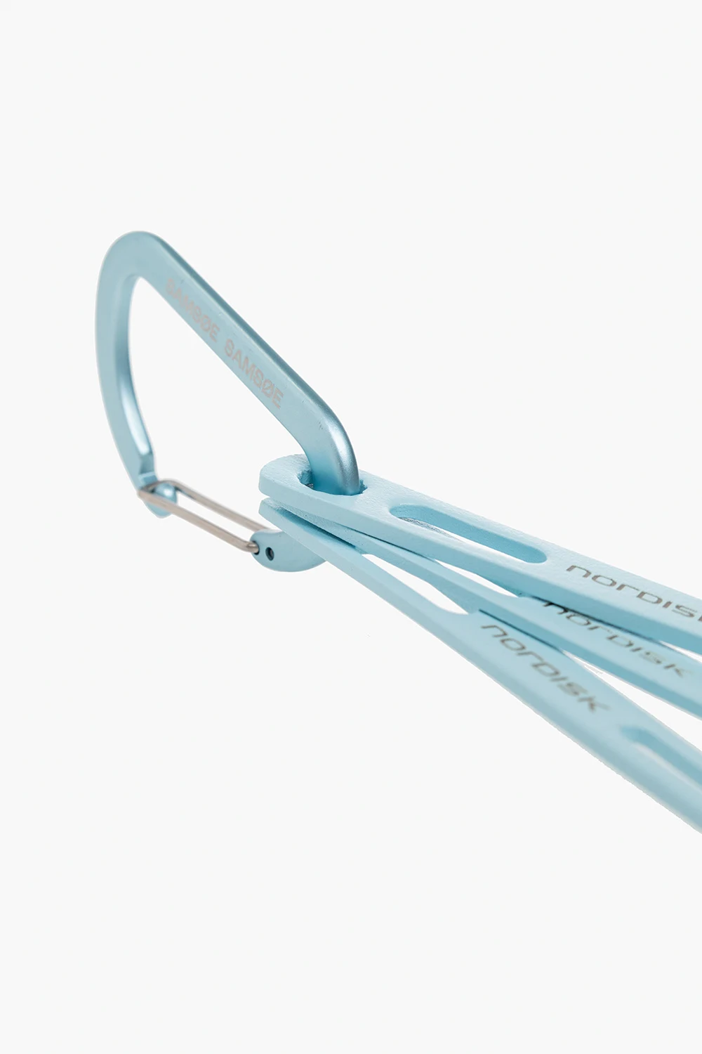 Podróżny, ognioodporny zestaw sztućców w kolorze jasnoniebieskim Samsoe Samsoe x Nordisk. Wykonany ze stali nierdzewnej. Kolorowe końcówki ozdobione nadrukowanym logo. Widelec, łyżka stołowa oraz nóż złączone aluminiowym karabińczykiem z logo. Można myć w zmywarce.