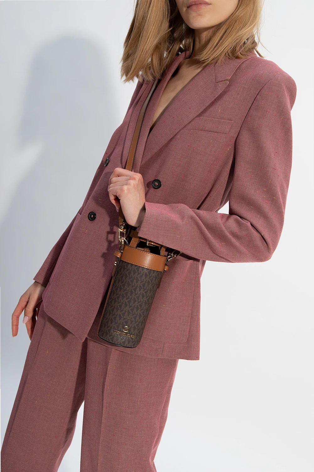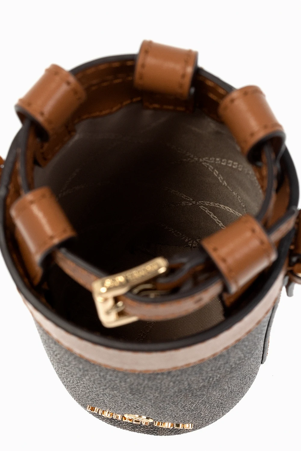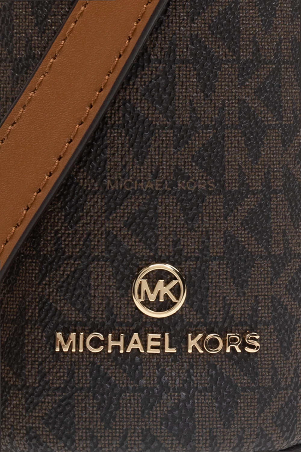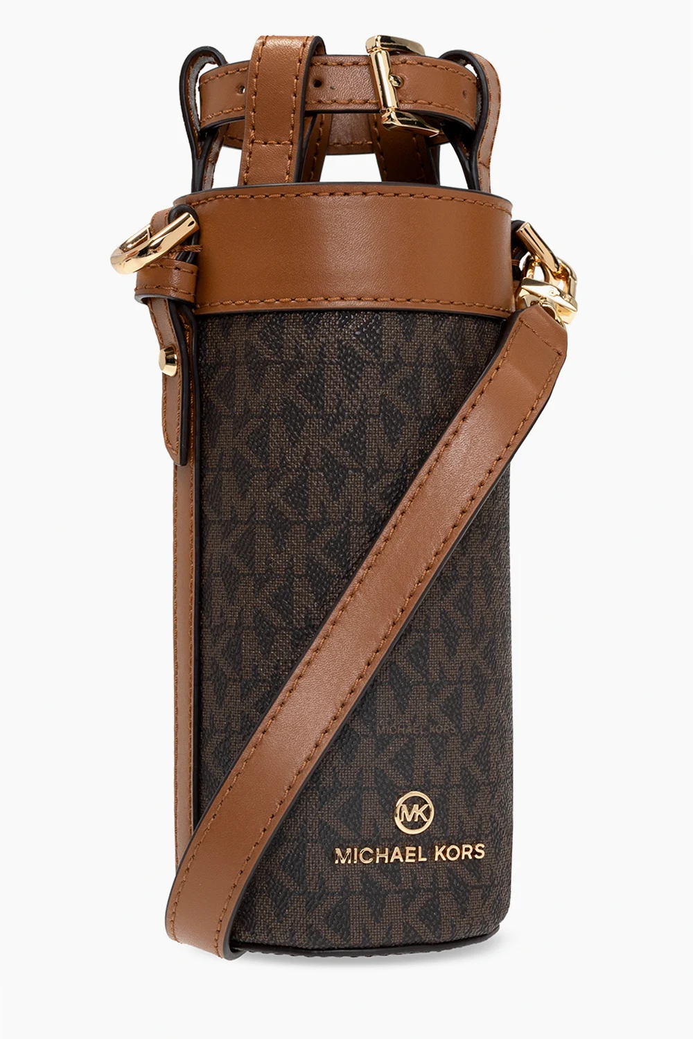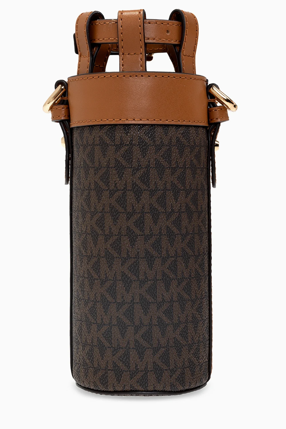 Brązowe etui na butelkę Michael Michael Kors. Wykonane z płótna z nadrukowanym wzorem. Wykończone skórą. Zapięcie na pasek z klamrą. Metalowa aplikacja z logo. Odpinany pasek na ramię z możliwością regulacji długości. Wewnątrz komora. Metalowe elementy w kolorze złotym.