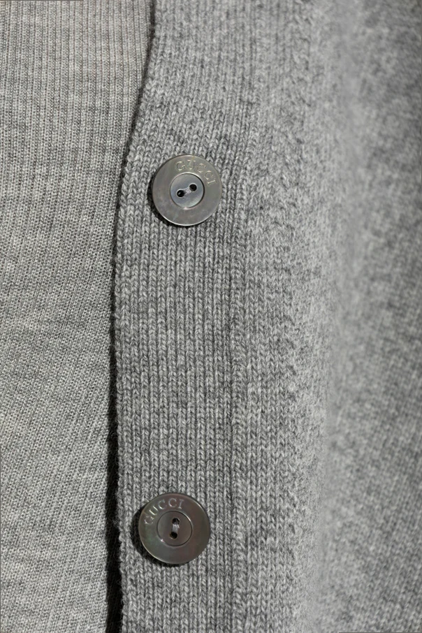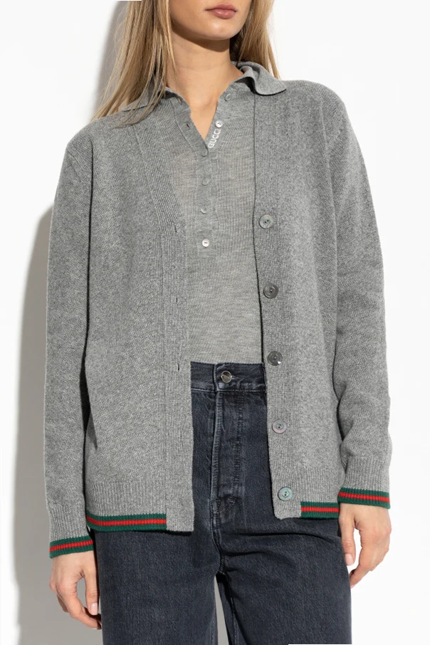 Klasyczny krój z długimi rękawami i zapięciem na guziki zapewnia ponadczasowy styl. Charakterystyczne, czerwono-zielone wykończenia na mankietach i u dołu podkreślają niepowtarzalny styl Gucci, zaś subtelne guziki z logo marki dodają mu wyrafinowanej elegancji. Kardigan stanowi idealne połączenie casualowego luzu z wytwornym szykiem, będąc wszechstronnym wyborem na każdą okazję.