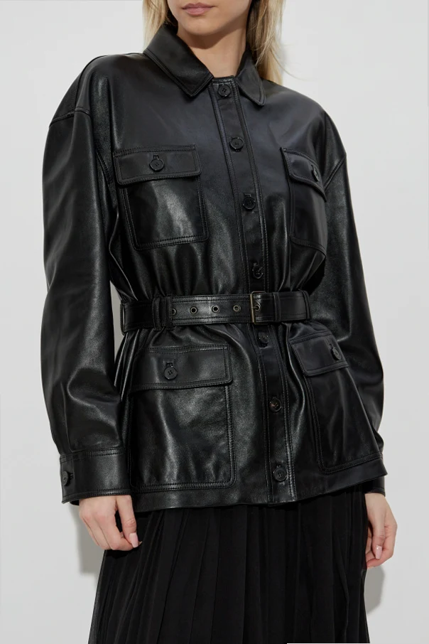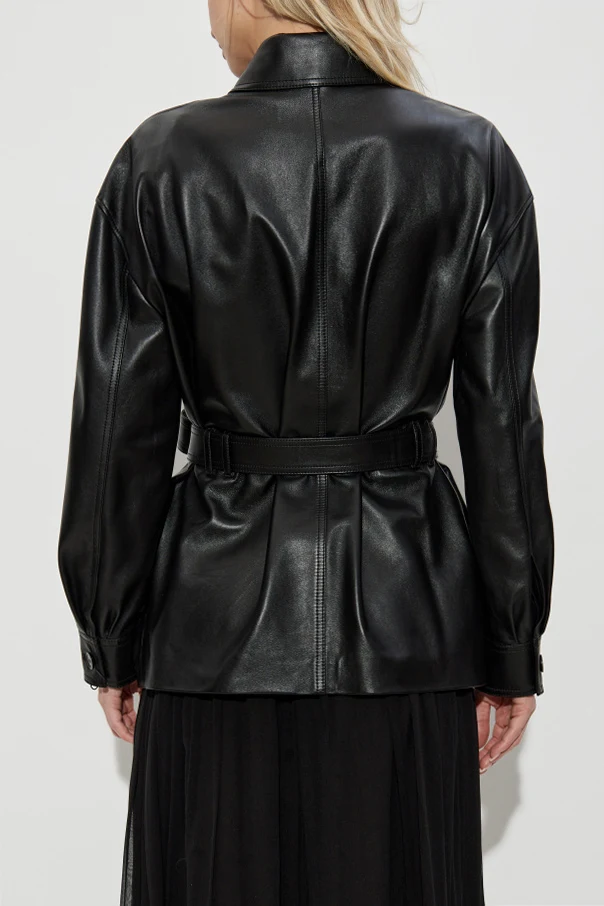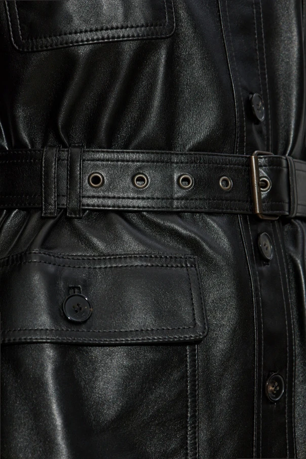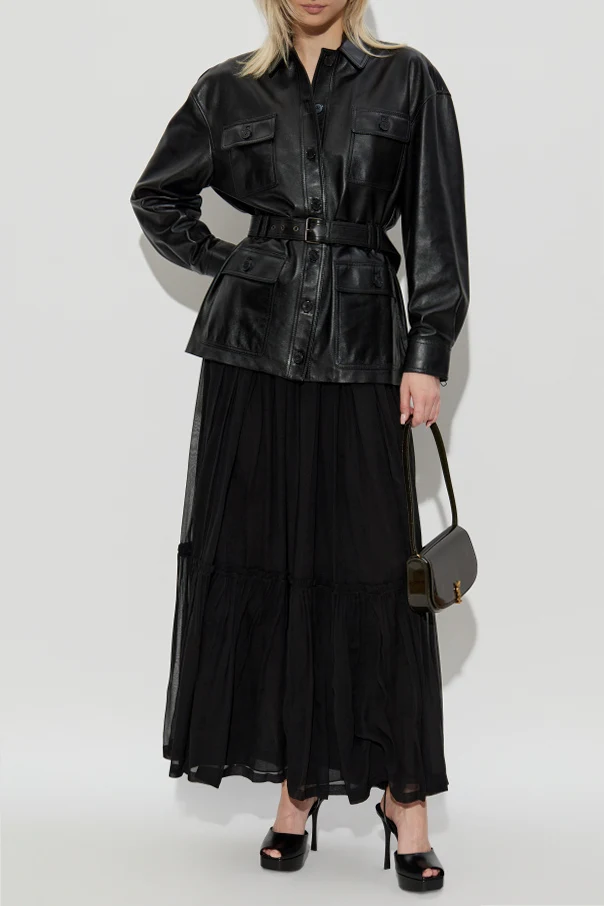 Przedstawiamy Skórzaną kurtkę z paskiem od renomowanego domu mody Saint Laurent , będącą esencją elegancji i wyrafinowania. Ten ekskluzywny element garderoby wykonany został z najwyższej jakości gładkiej, czarnej skóry jagnięcej, co nadaje mu niepowtarzalny luksusowy wygląd.