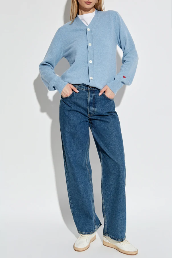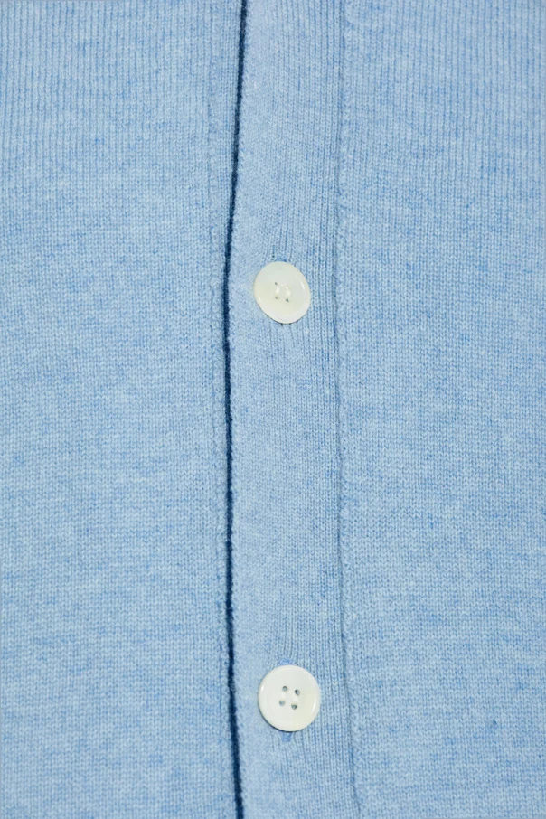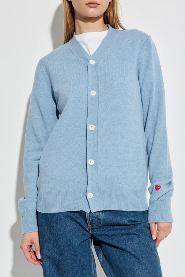 Przedstawiamy Kardigan z naszywką z logo z ekskluzywnej kolekcji Comme des Garçons Play. Ten olśniewający jasnoniebieski kardigan stworzony jest z najwyższej jakości wełny, co nadaje mu niebywałą miękkość i komfort noszenia. Klasyczny krój z długimi rękawami, uzupełniony białymi guzikami, stanowi kwintesencję elegancji i stylu.