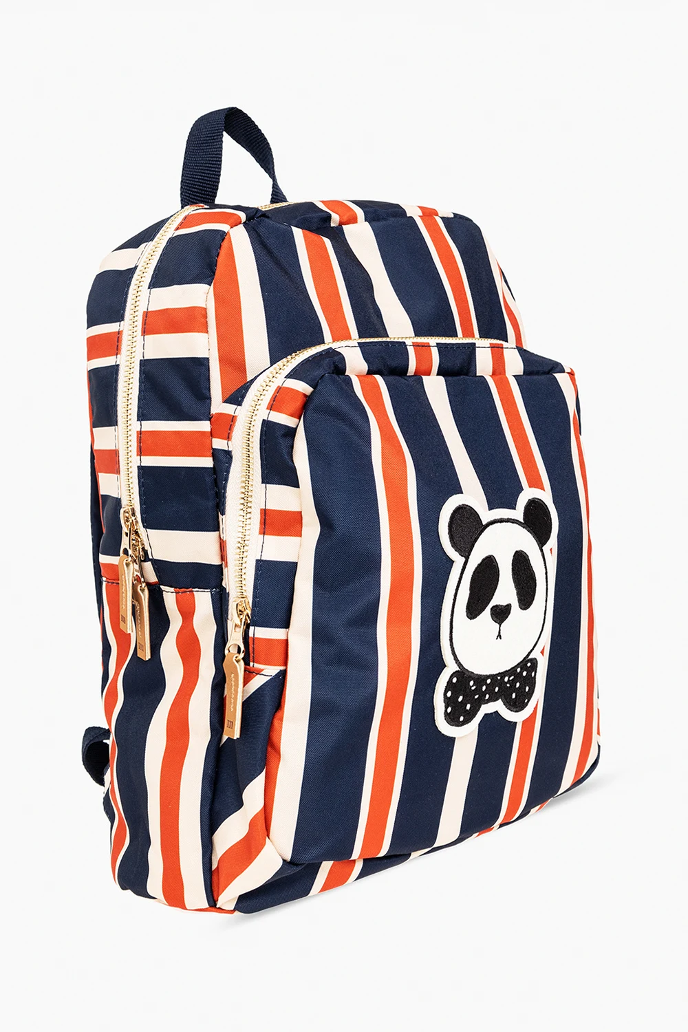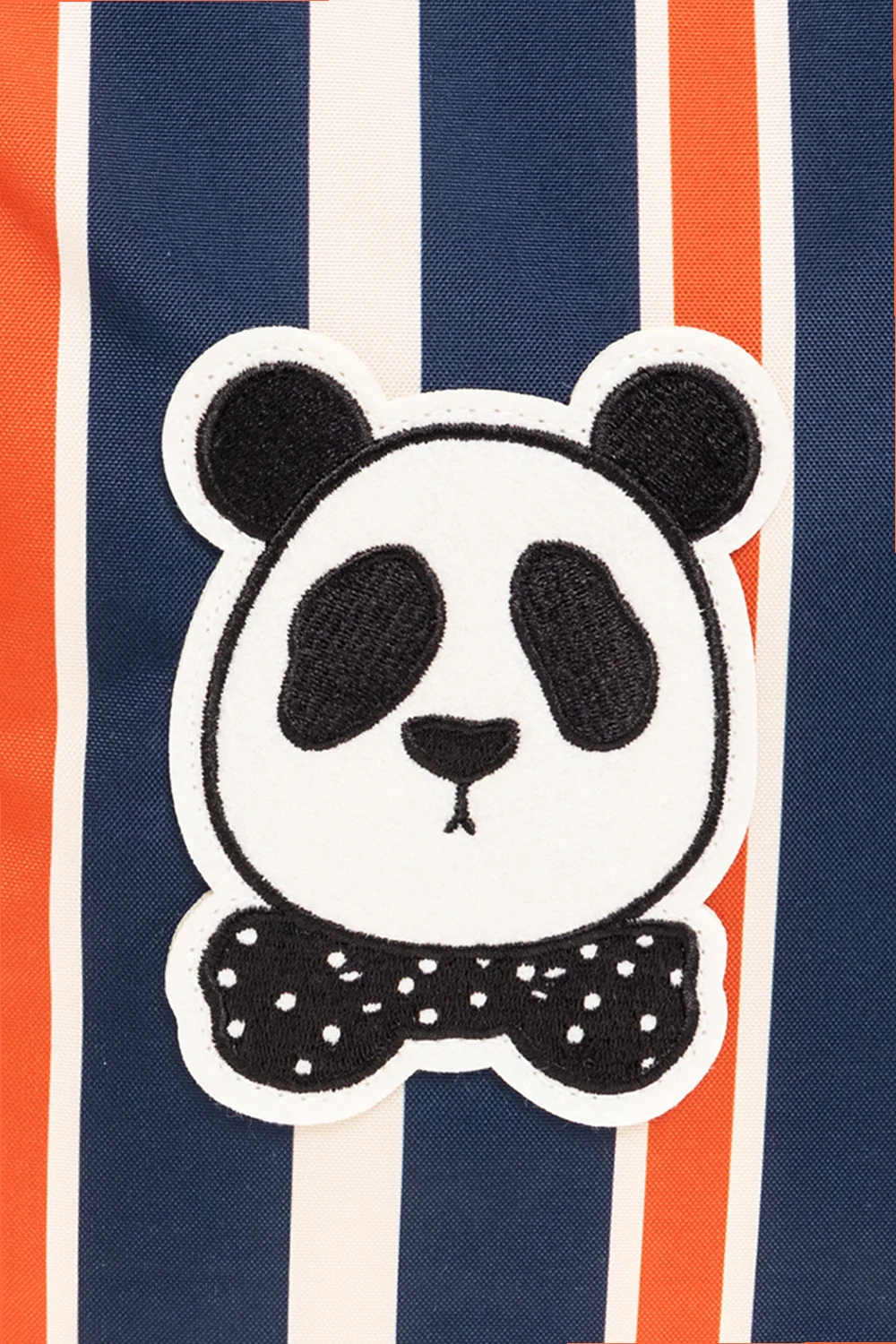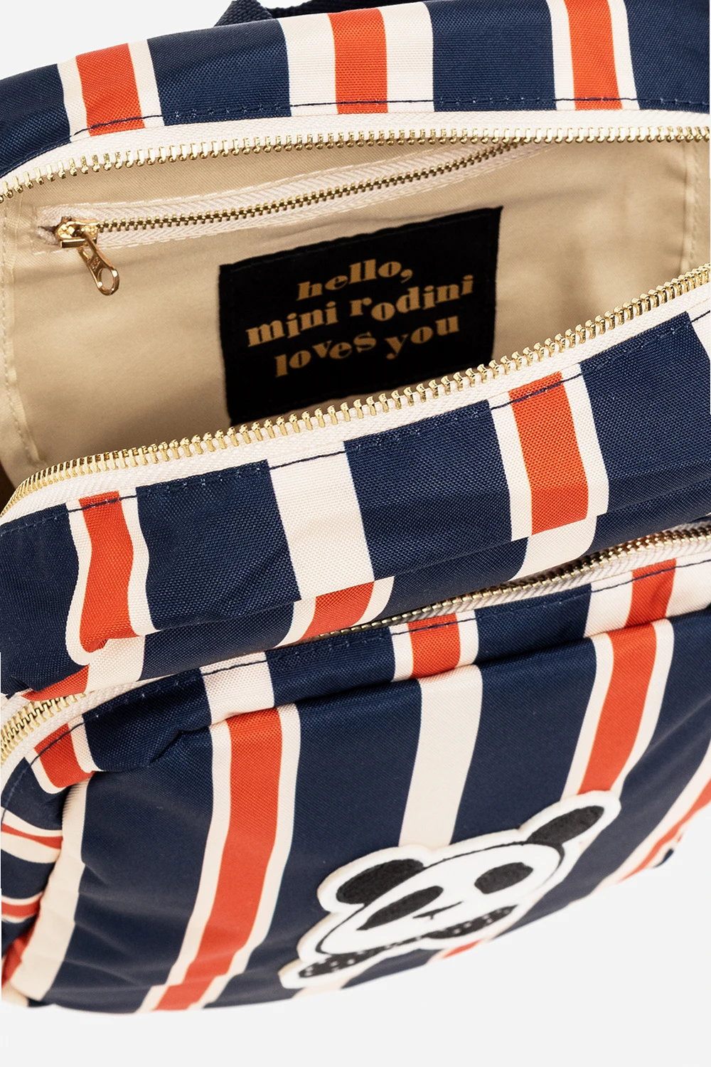 Beżowo-granatowo-pomarańczowy plecak Mini Rodini. Wykonany z materiału z recyklingu. Zamykany na zamek. Ozdobiony naszywką z motywem zwierzęcym oraz wzorem w pasy. Z przodu kieszeń zamykana na zamek. Półokrągła rączka. Szelki z możliwością regulacji długości.
