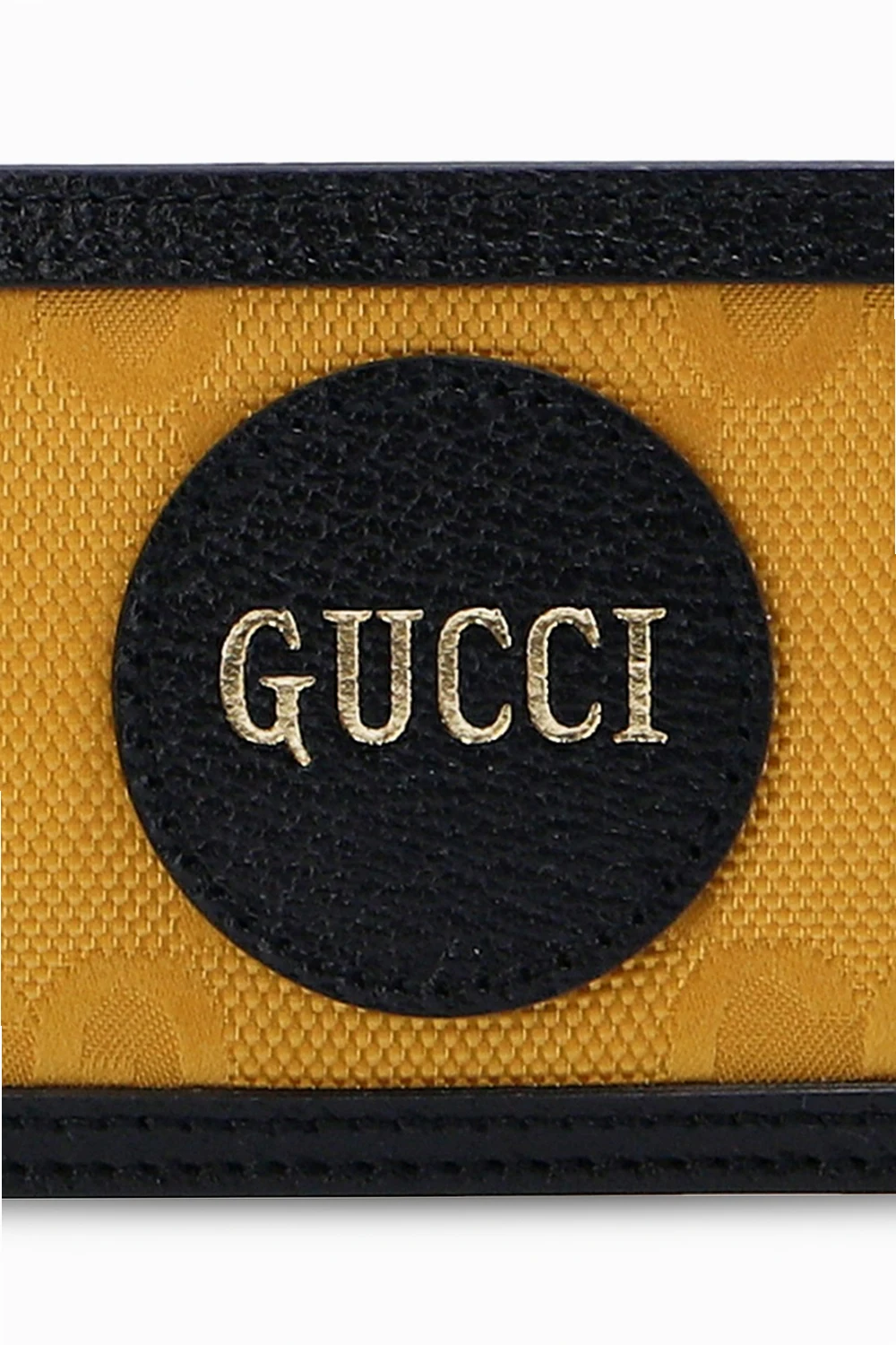 Czarno-żółte etui na karty Gucci. Wykonane ze skóry. Wykończone eko nylonem z wyszytym logo. Z przodu nadrukowane logo w kolorze złotym. Trzy miejsca na karty.