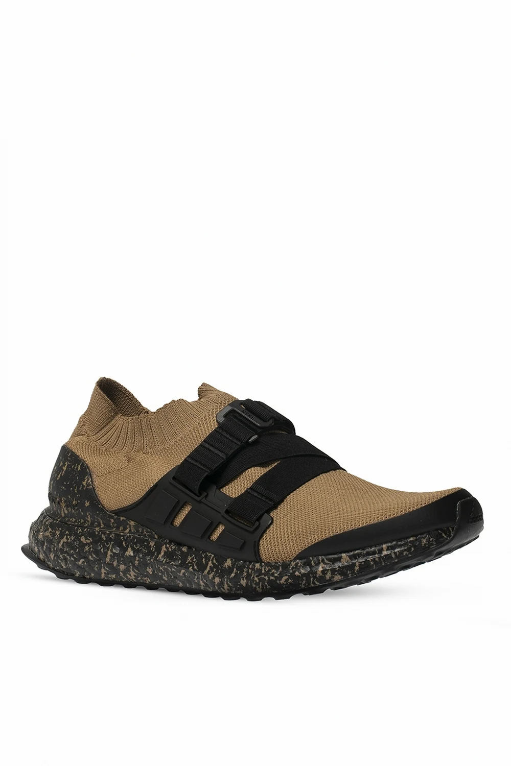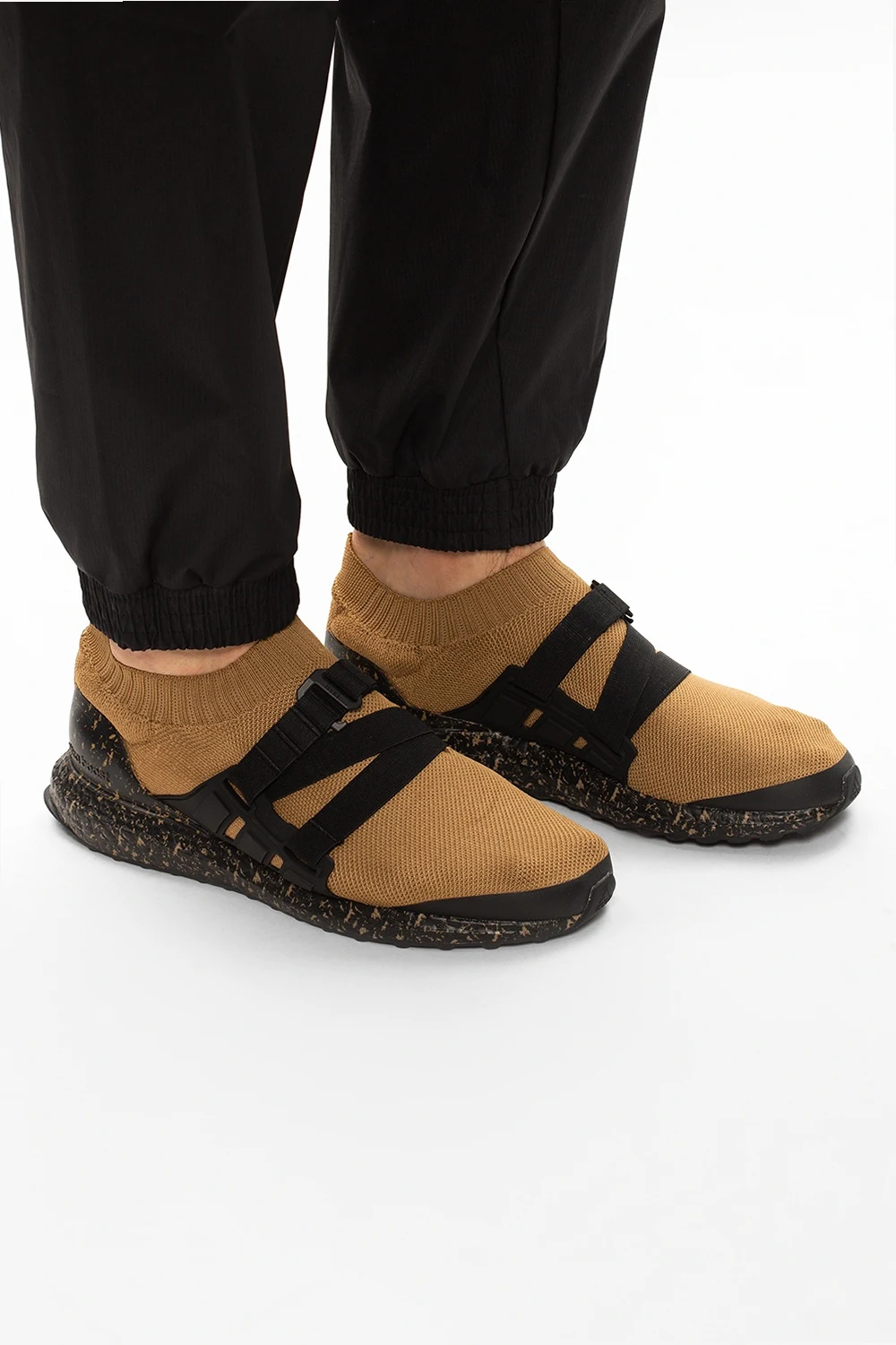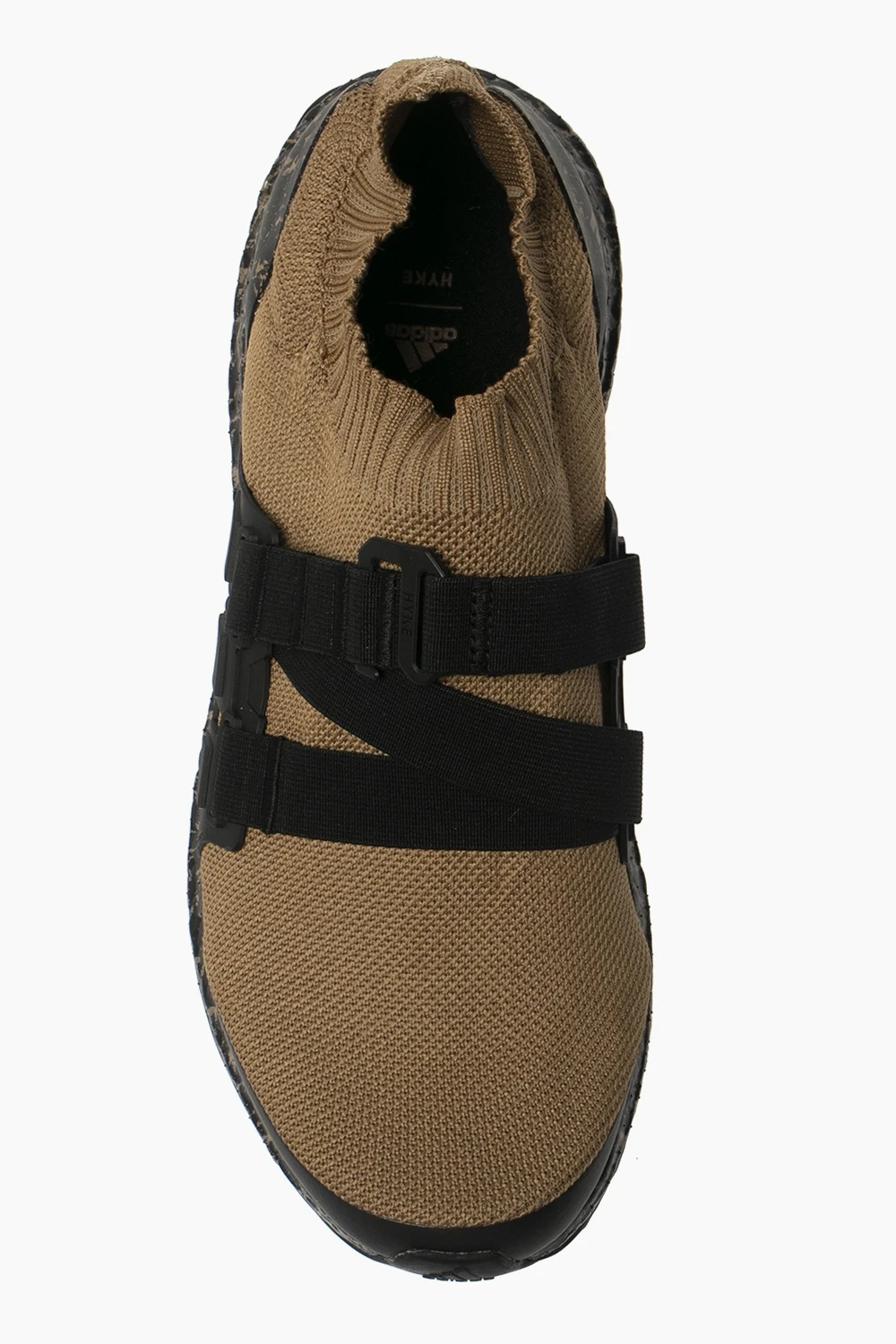 Brązowe buty sportowe ze skarpetą, model ‘Ultraboost AH-001’ ADIDAS Performance, kolekcja 'adidas by HYKE'. Cholewka wykonana ze stworzonego przez markę materiału Primeknit. Pasek zapewniający idealne dopasowanie do stopy. Podeszwa środkowa z amortyzacją BOOST. Czarno-biała, gumowa podeszwa.